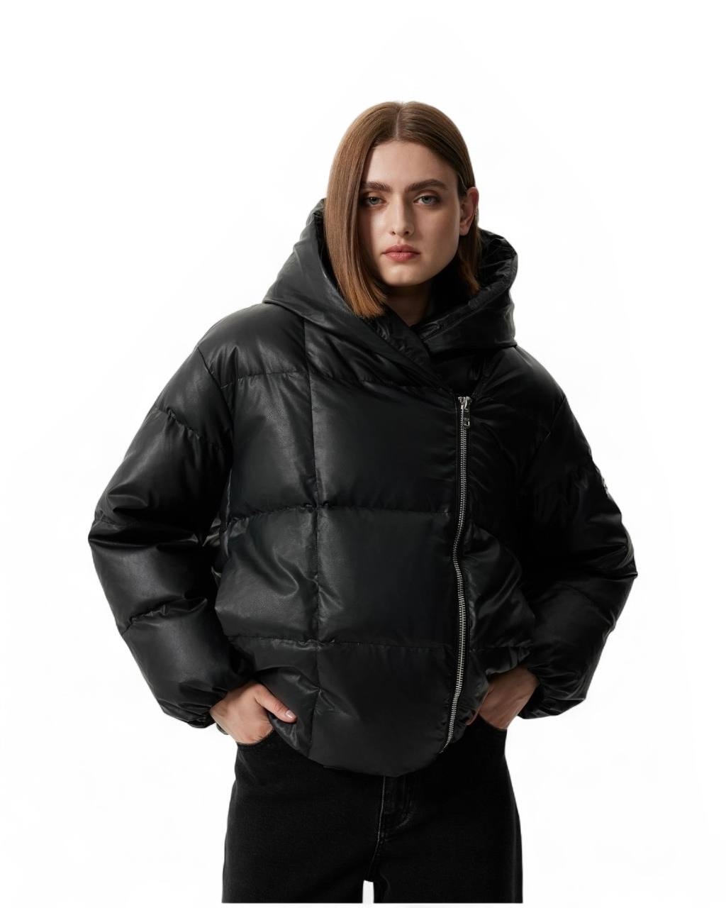 Черная стеганая куртка на натуральном пуху проявит себя с лучшей стороны в зимних условиях. Куртка выполнена из влагостойкой плащовки с мягким полиуретановым покрытием, и визуально, и тактильно напоминающим натуральную кожу. Уютная О-образная форма модели с глубоким цельнокроенным капюшоном и асимметричная застежка на металлическую молнию делают куртку очень мягкой, стильной, комфортной. В нее можно спрятаться, укрывшись от всех погодных невзгод, чтобы в полной мере ощутить радость обладания теплой и практичной вещью. Куртка имеет карманы в боковых швах, закрывающиеся на потайные молнии.