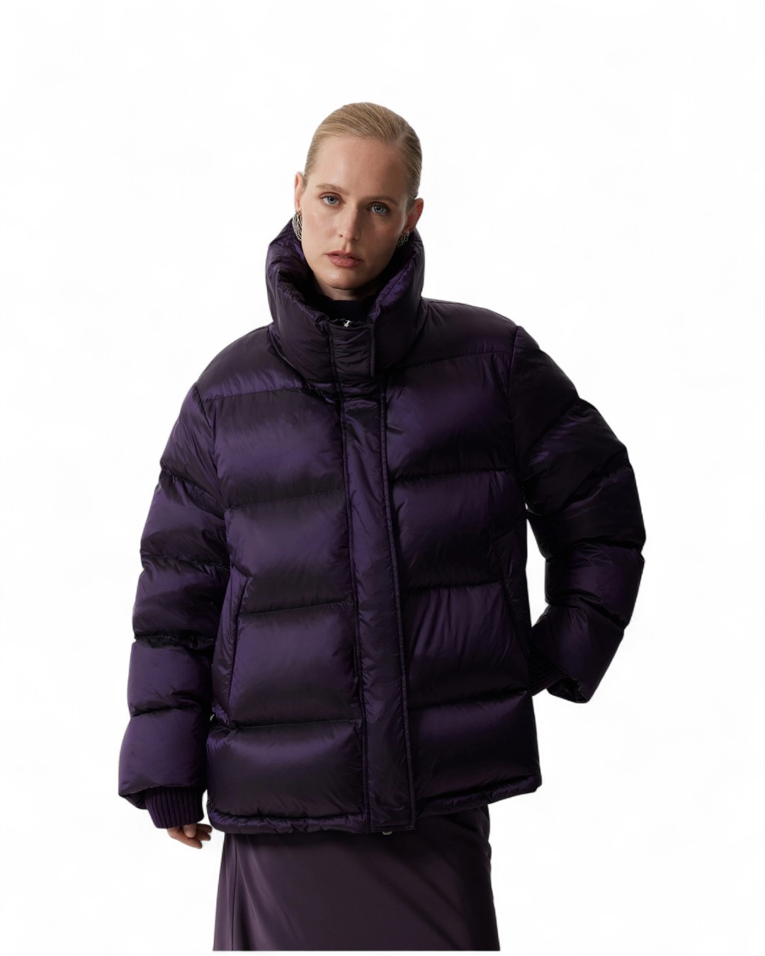 Стеганая куртка на натуральном пуху — олицетворение уюта, комфорта, защищённости. Выполненная из гладкой влагостойкой плащовки с благородным матовым блеском, куртка силуэта умеренный оверсайз — прекрасный городской вариант, сочетающий в себе элегантность кэжуала и динамику спортивного стиля. Минималистичный дизайн модели с высокой стойкой без капюшона фокусирует внимание на лёгкости, продуманности, высочайшем качестве исполнения изделия. Уютные вязаные манжеты создают интересную игру фактур, наделяя куртку приятными и визуально, и тактильно акцентами. Эта та самая лаконичная и добротная базовая зимняя вещь, которая должна быть в гардеробе стильной женщины, ценящей тепло и комфорт. Трендовый цвет, объединивший палитру аппетитных оттенков спелого инжира, баклажана, винограда, придаёт куртке уникальные черты. Она может быть частью монохромного комплекта с трикотажными и текстильными брюками, свитером, водолазкой, а также красиво завершит образ, построенный на контрасте с серым, молочным, чёрным. Куртка застёгивается на серебряную металлическую молнию с двумя пуллерами и имеет ветрозащитную планку с потайными кнопками. Глубокие карманы-листочки создают необходимое удобство в эксплуатации вещи. Куртка оснащена внутренней утяжкой по нижнему краю, способной создать дополнительную защиту от продувания.