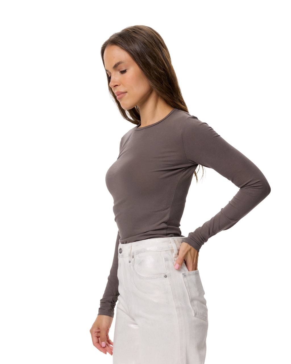 Базовый,минималистичный лонгслив из хлопка в графитовом цвете — это классический и незаменимый элемент гардероба.