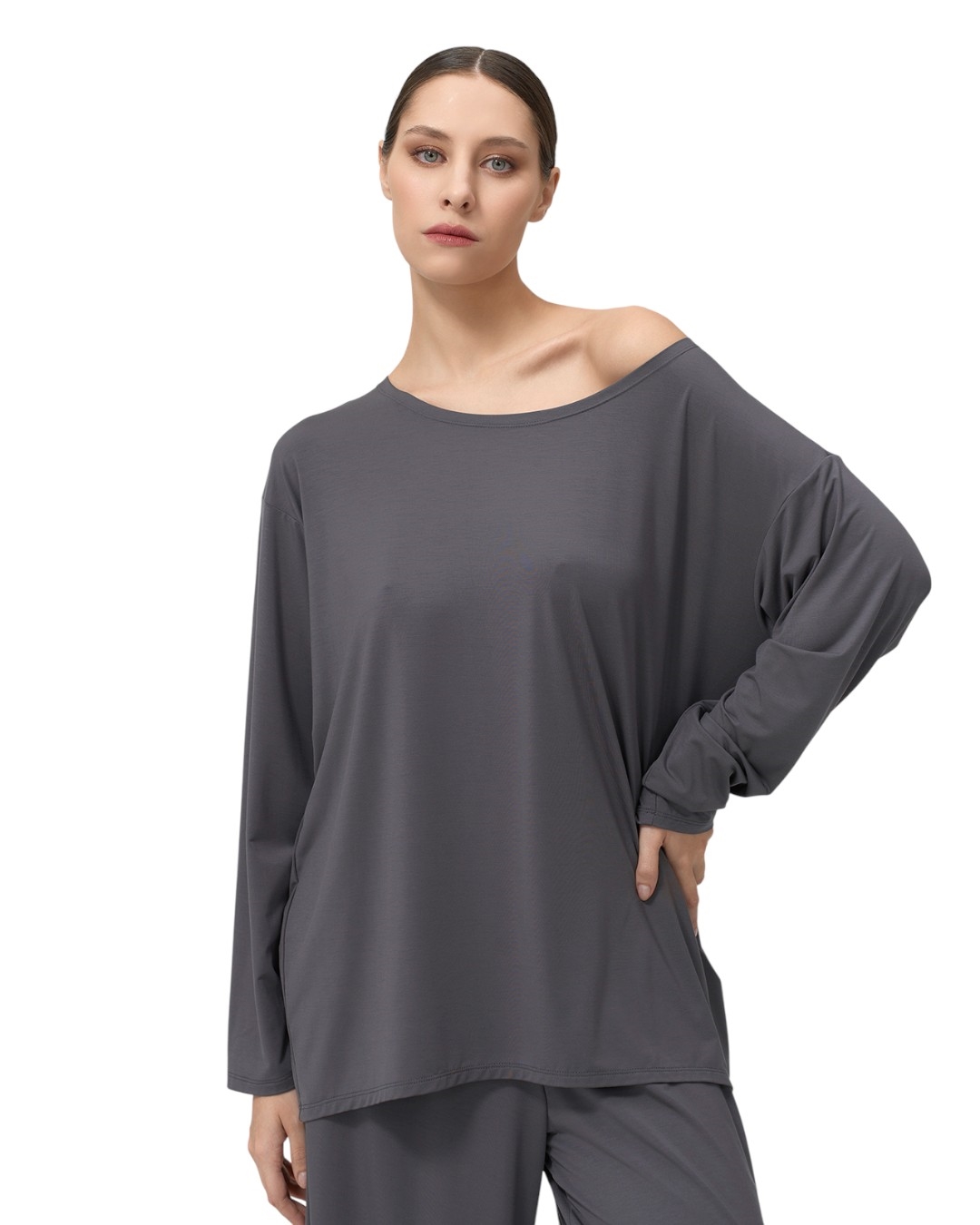 Лонгслив свободного кроя с глубокой круглой горловиной. Выполнен из мягкого модала. Скользящая, дышащая ткань приятна телу. Лонгслив можно спустить на одно плечо, завязать узлом на талии или носить свободно с брюками из этого комплекта. Прекрасный вариант для повседневных образов и пляжного отдыха.