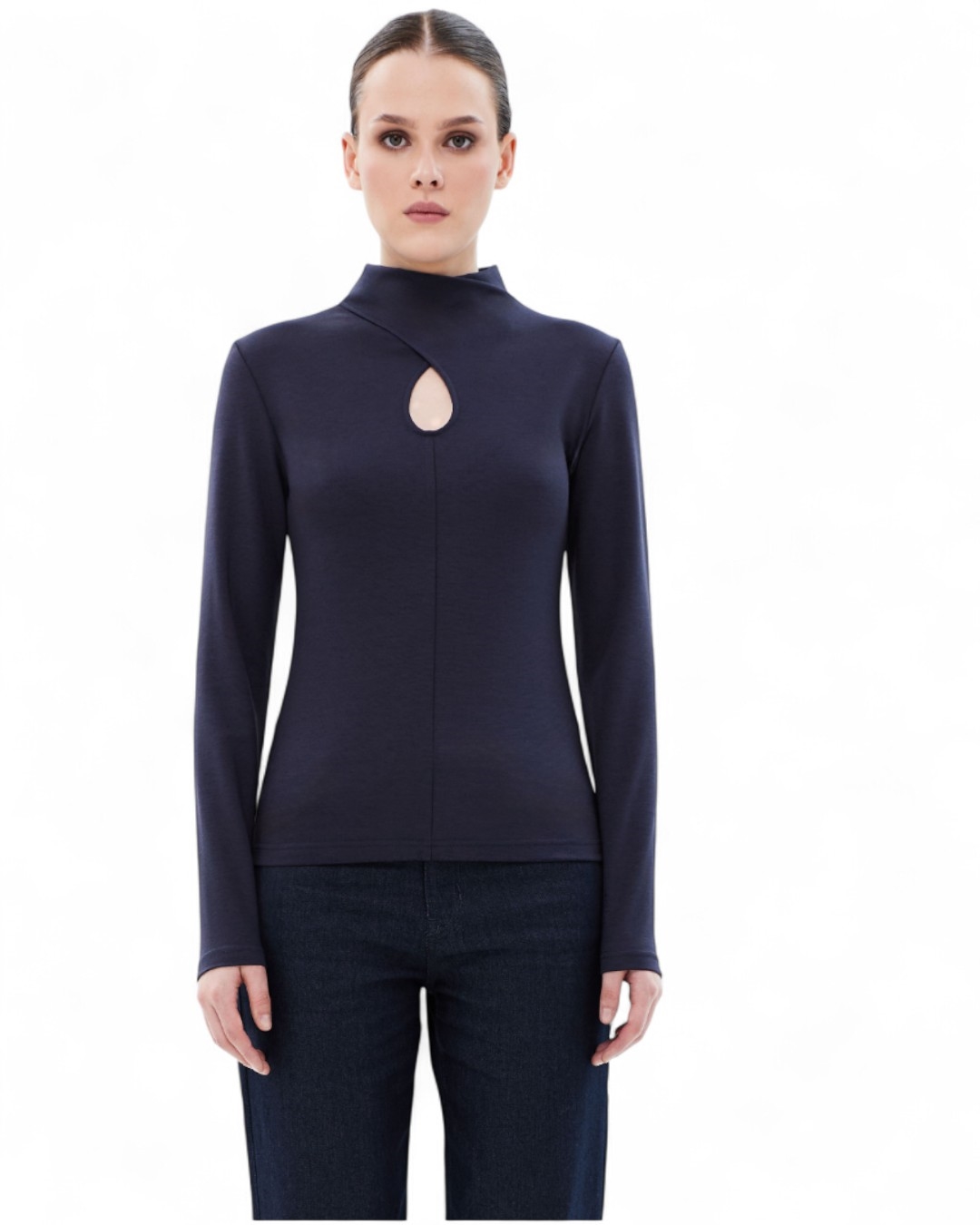 Водолазка из плотного эластичного трикотажа. По переду вырез-«капля», добавляющий образу утончённости.