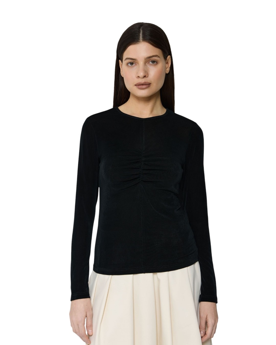 У модели округлый вырез горловины, длинный втачной рукав и сборка по центру груди в качестве акцента.