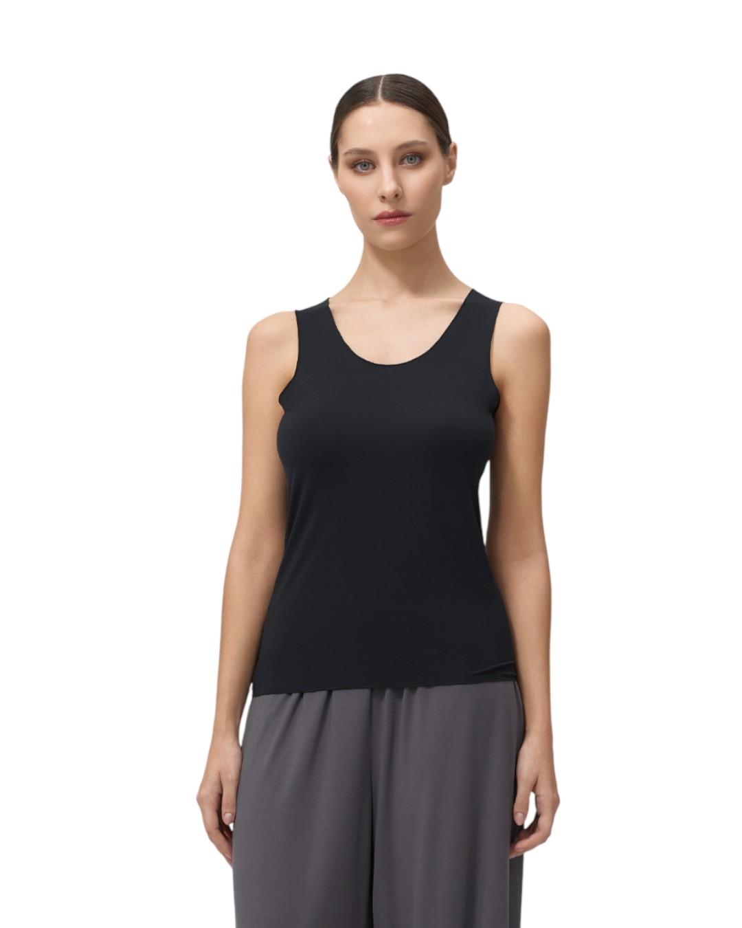 Базовая трикотажная майка из модала. Скользящая, дышащая ткань приятна телу и незаменима в летний сезон. Посадка по фигуре, мягкая ткань не стесняет движений. Можно носить как самостоятельное изделие или под пиджак и куртку, создавая более уютные и интересный повседневные образы.