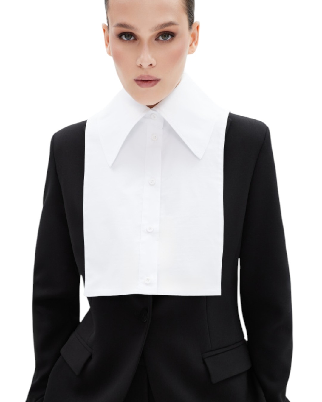 Манишка с отложным рубашечным воротником. Перед манишки удлинён. Модель выполнена из хлопка с содержанием эластана.