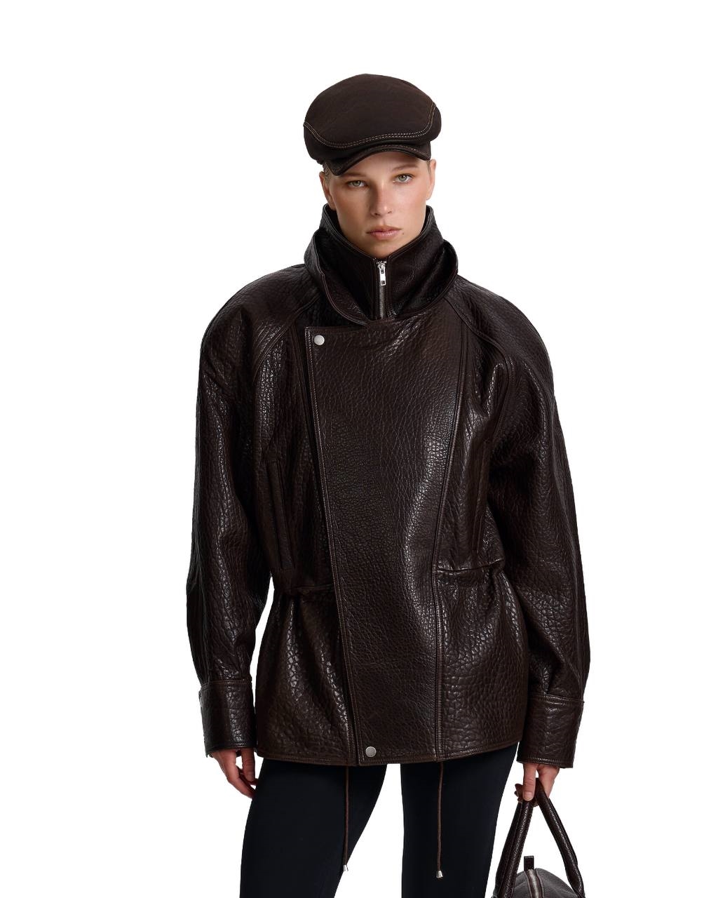 Парка силуэта oversize сшили из зернистой кожи ягненка. Модель с боковыми карманами застегивается молнией и клапаном с кнопками.