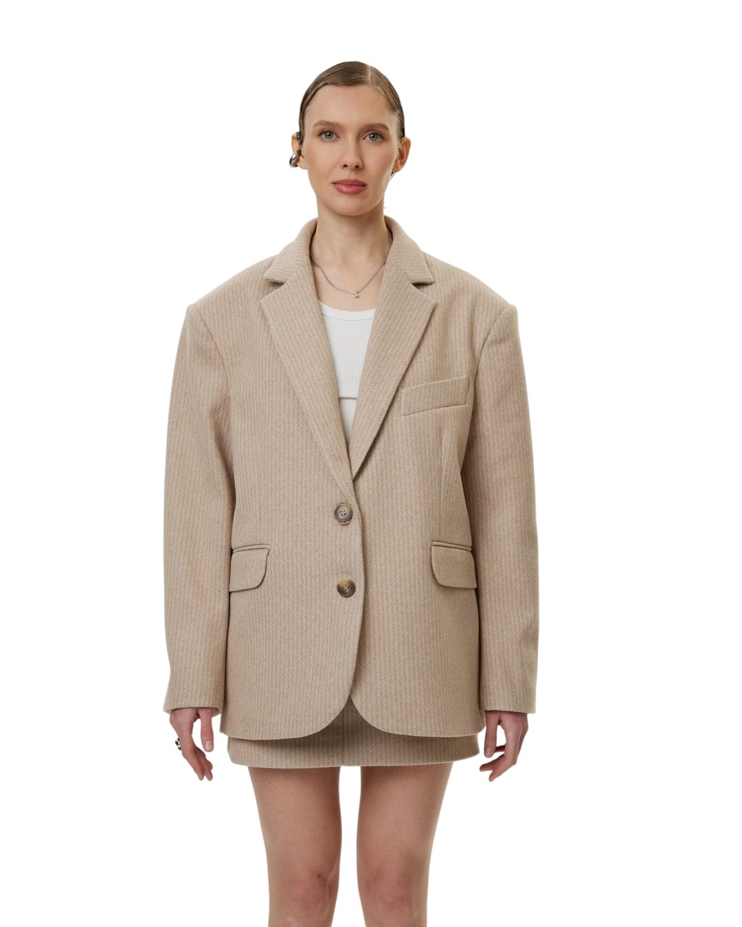 Для завершенности образа мы рекомендуем носить пиджак в комплекте с юбкой.