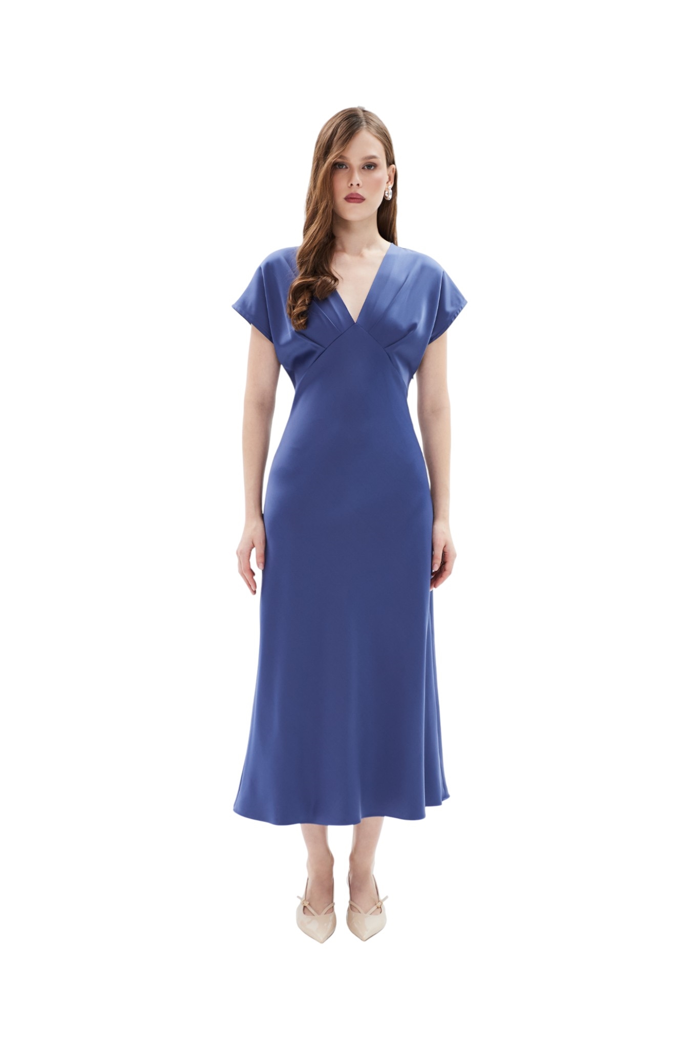 Платье миди выполнено из гладкого атласа. Пошив по косой создаёт мягкое и естественное прилегание к фигуре, а расклешённый к низу крой добавляет лёгкости и движения образу.