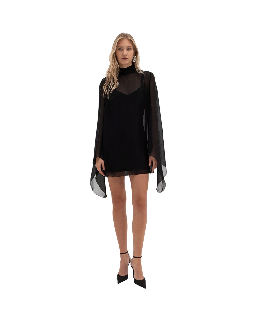 Двойное платье из шифона в длине мини. Верхний слой платьяиз штфона имеет прямой силуэт , воротник-стойка с застежкой на пуговицы. Акцентная деталь - длинные расклешенные рукава. Нижнее платье-футляр из трикотажного полотна можно носить как самостоятельное изделие. Благодаря свободному силуэту будет хорошо смотреться на любом типе фигуры.
