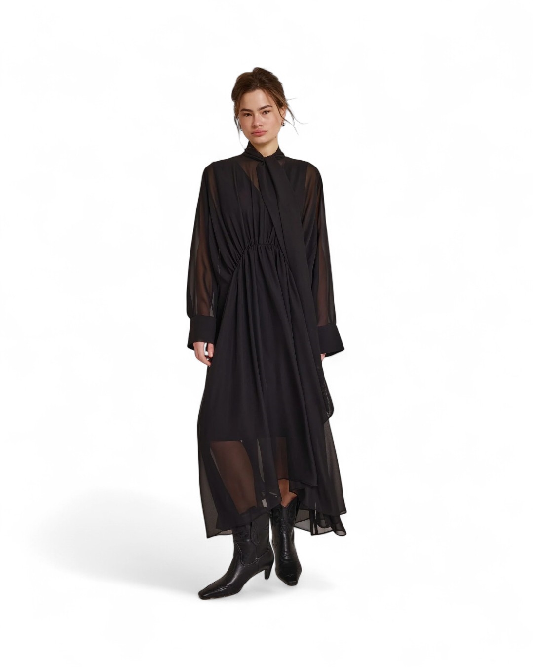 Платье выполнено из легкого шифона, нижняя комбинация на широких комфортных бретелях и верхнее летящее платье с втачным шарфом. Декоративные сборки на асимметричной линии шва талии зрительно вытягивают силуэт. Нежный акцент – ленты – трансформируются по мановению фантазии: это может быть классический галстук, романтичный бант или просто струящийся шлейф.