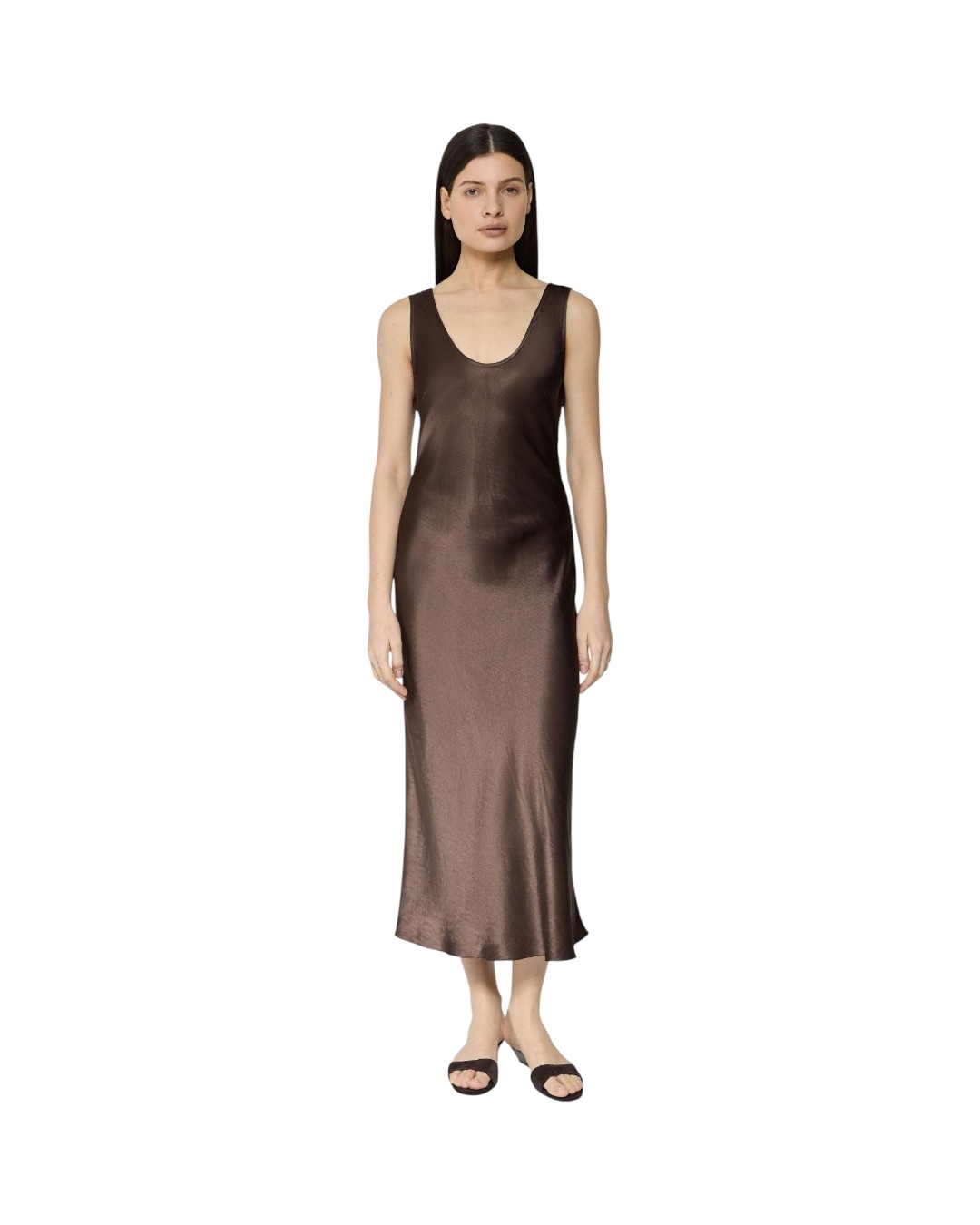 Платье-комбинация длины миди выполнено из смесовой атласной вискозы. Комбинация на широких бретелях, удлиненный овальный вырез горловины спереди и сзади, нагрудные вытачки спереди и средний шов по спинке красиво очерчивают силуэт, а косой крой комбинации принимает форму тела и мягко струится, подчеркивая силуэт. Округлый удлиненный вырез спереди и сзади.