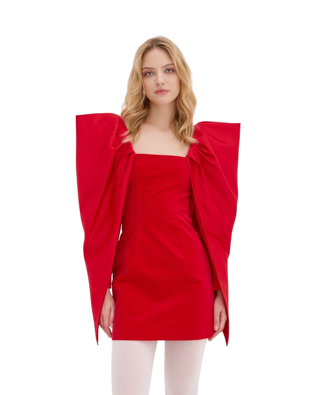 Платье прилегающего силуэта, длины мини, из хлопкового бархата, на подкладке. Платье с вырезом карэ. Рукав двойной, с объемной драпировкой из атласа в форме платка, завязанного на узел вокруг головы русской боярыни. Застежка молния расположена по центру спинки.