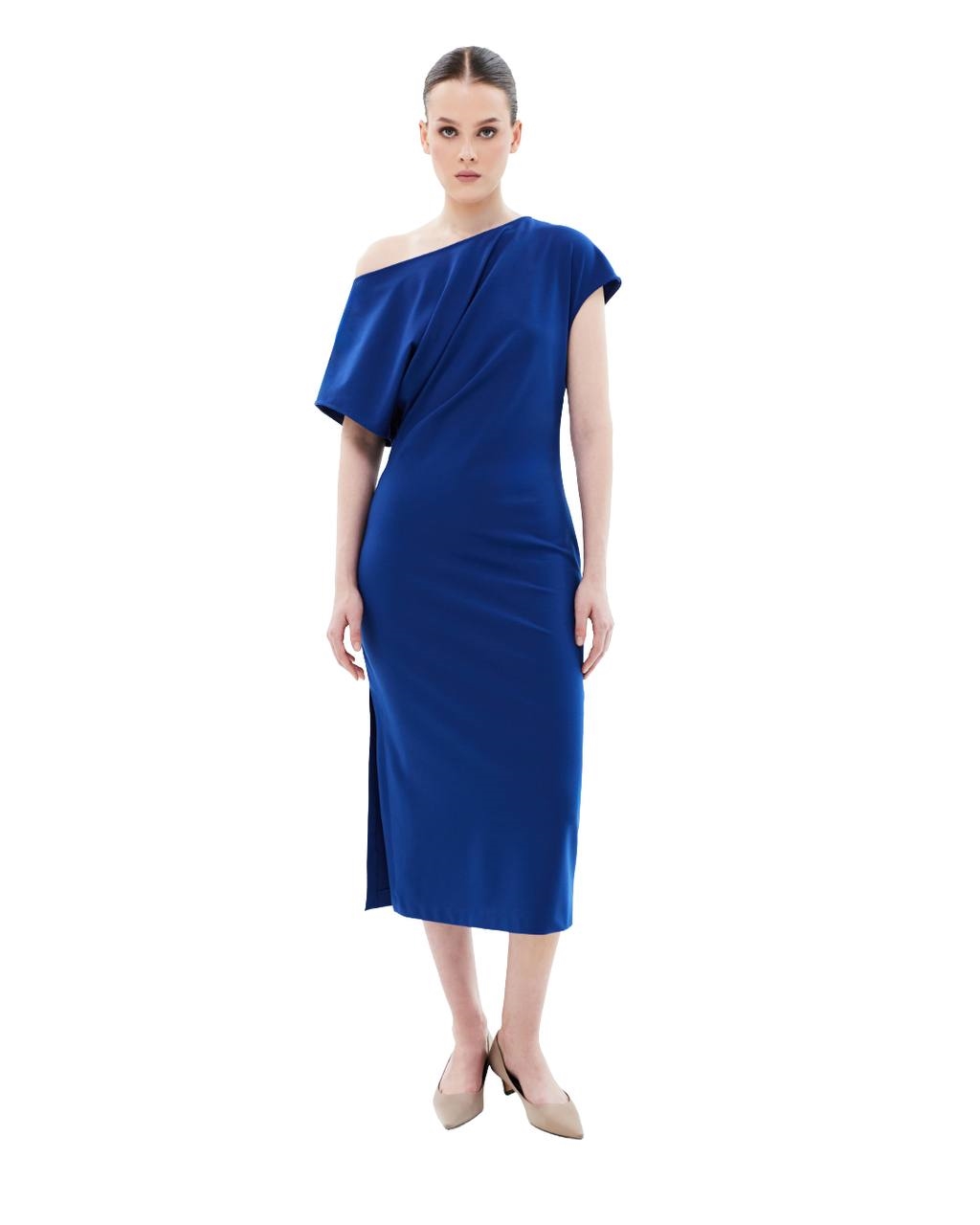 Платье из джерси с асимметричным кроем, открывающее плечо и играющее длиной миди