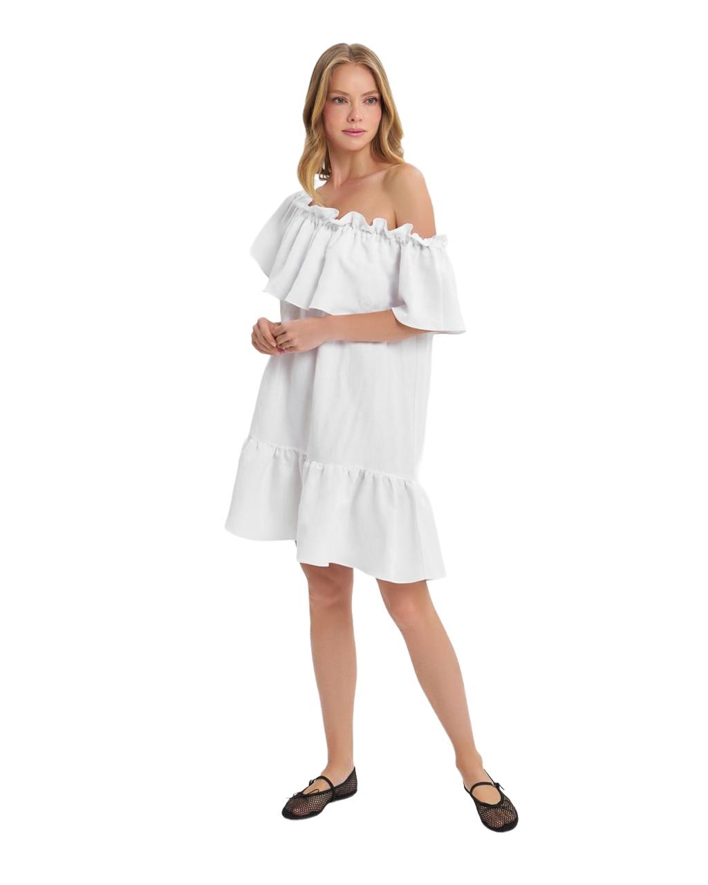 Белое платье свободного кроя украшено рюшами и имеет спущенные плечи, создавая легкий и непринужденный образ. Ткань мягкая и приятная на ощупь, обеспечивает комфорт весь день. Модель подходит для повседневных и романтических случаев. Рюши добавляют небрежную, женственную нотку.