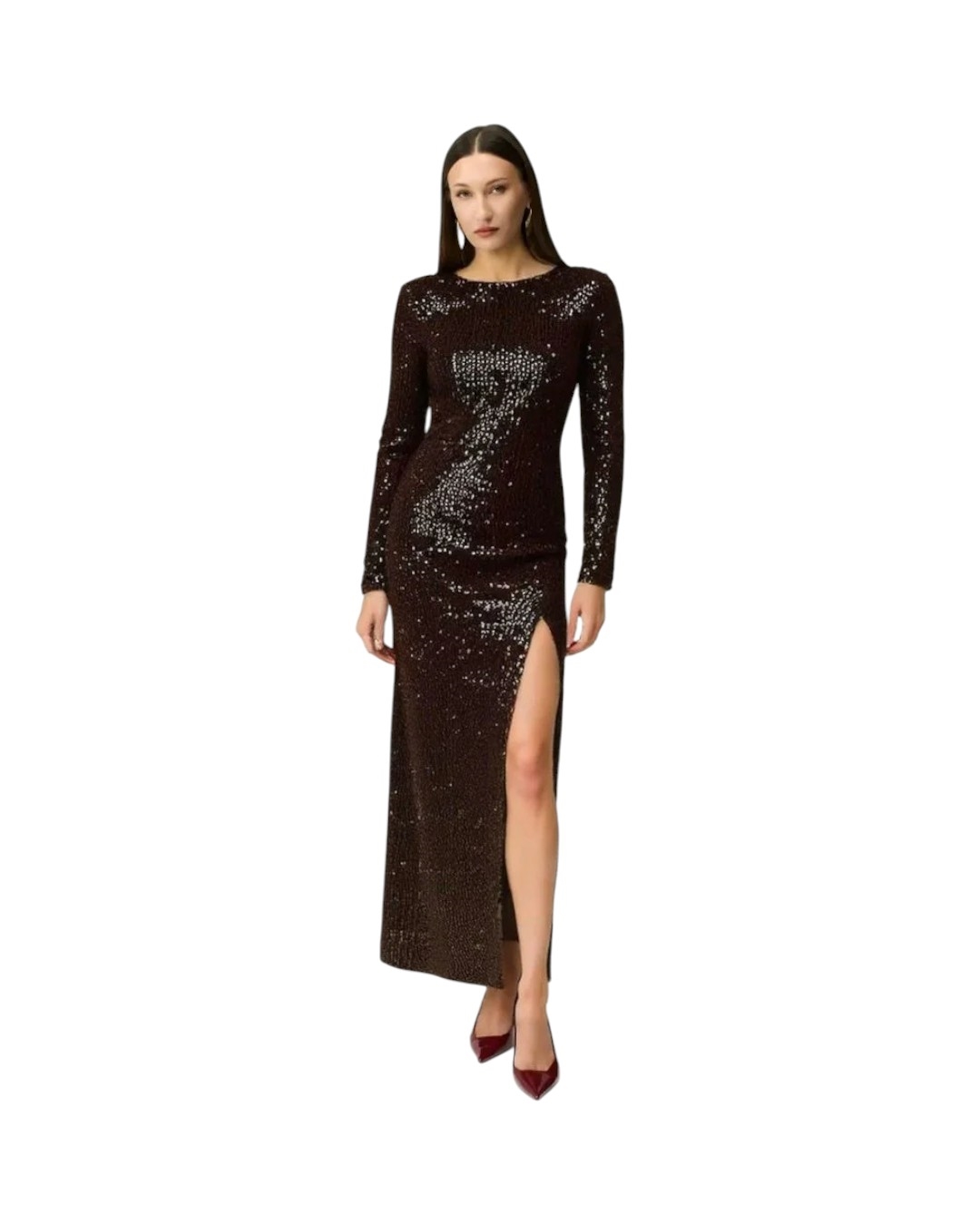 Элегантное платье с вырезом на спине и ноге, украшенное пайетками, выполнено из бархата. Это идеальный выбор для любого торжественного мероприятия. Благодаря изысканному декору из пайеток и мягкой ткани платье выглядит нарядно и элегантно. Оно идеально подойдёт для особых случаев, позволяя создать стильный и запоминающийся образ.