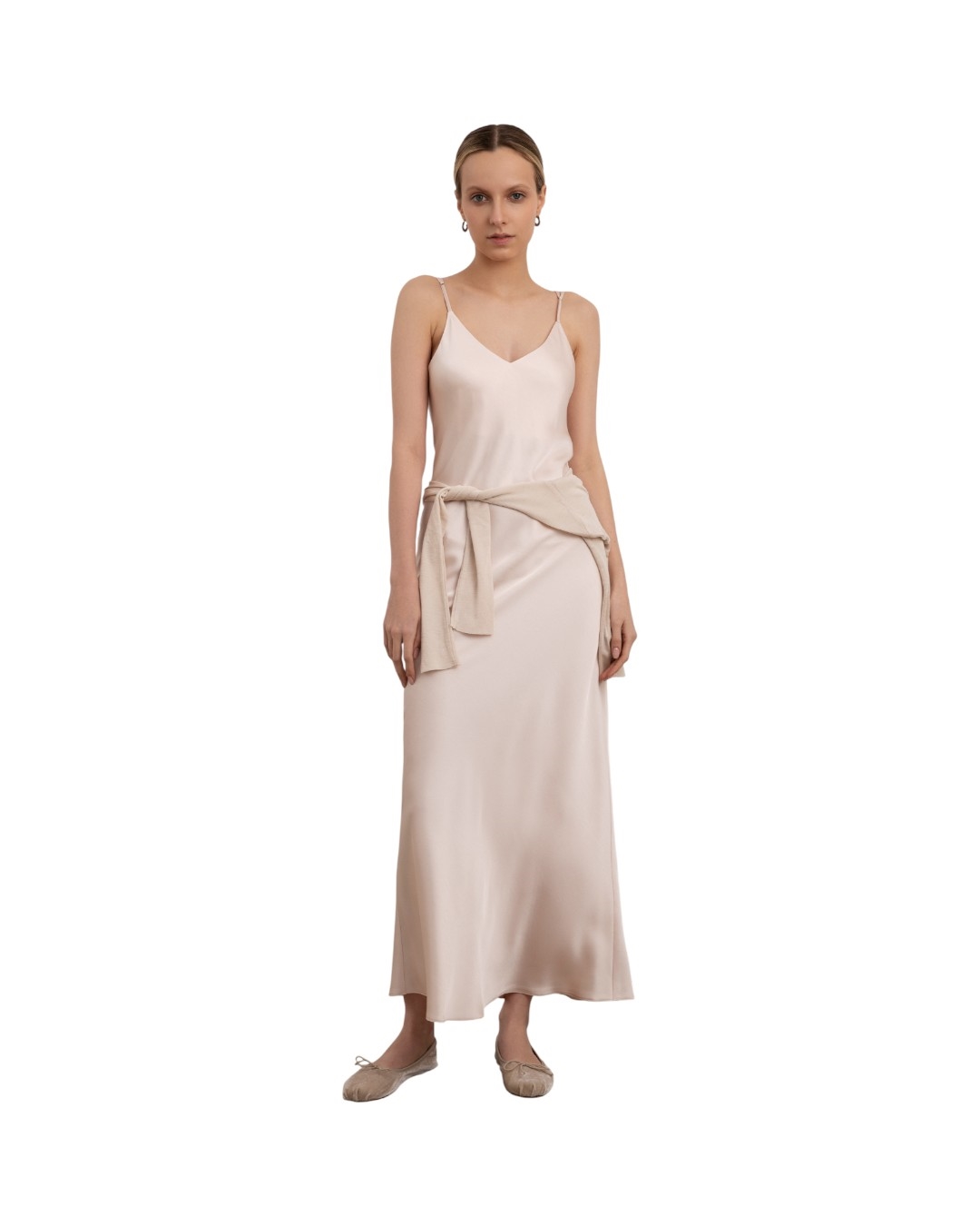 Платье-комбинация с V-образным вырезом горловины на тонких регулируемых бретелях. Спинка платья с углубленным вырезом горловины. Платье выполнено из шелковистой приятной к телу ткани с атласной поверхностью. Длина миди.