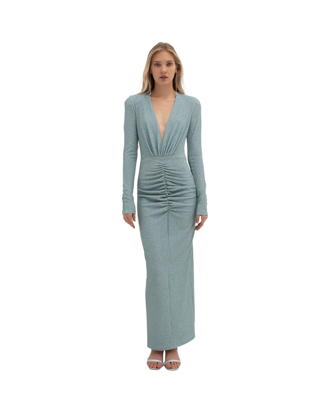 Трикотажное платье с люрексом в длине макси в красивом ментоловом оттенке. Глубокий v-образный вырез, узкий рукав, драпировки на груди и бедрах, прилегающий силуэт. Поможет вам создать эффектный образ для любого торжества.