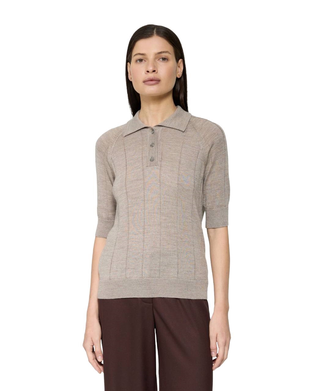 Поло прямого кроя с коротким рукавом из смесового мериноса с вискозой. Не плотная тонкая вязка высокого класса. Материал очень нежный к коже, будет не жакро, но при этом тепло –– отличная база под жакеты.