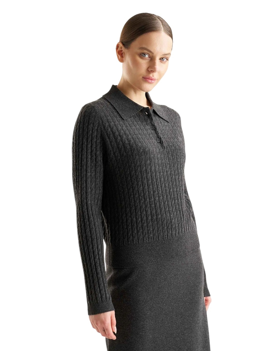Лаконичная модель для повседневного стиля. Поло выполнено из мягкой пряжи с рельефным узором «косы» и длинными рукавами. Застежка на пуговицах на груди позволяет регулировать глубину выреза. Классический крой создает универсальный дизайн для базового гардероба.