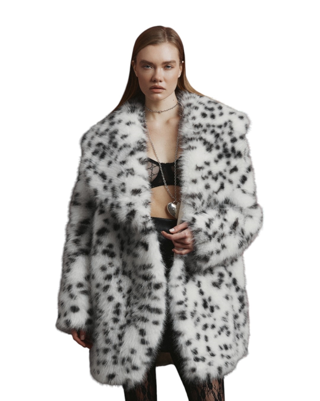 Шуба из экомеха с принтом "Рысь" в черную крапинку. Имеет мягкий ворс средней длины, застегивается на магнитные кнопки.