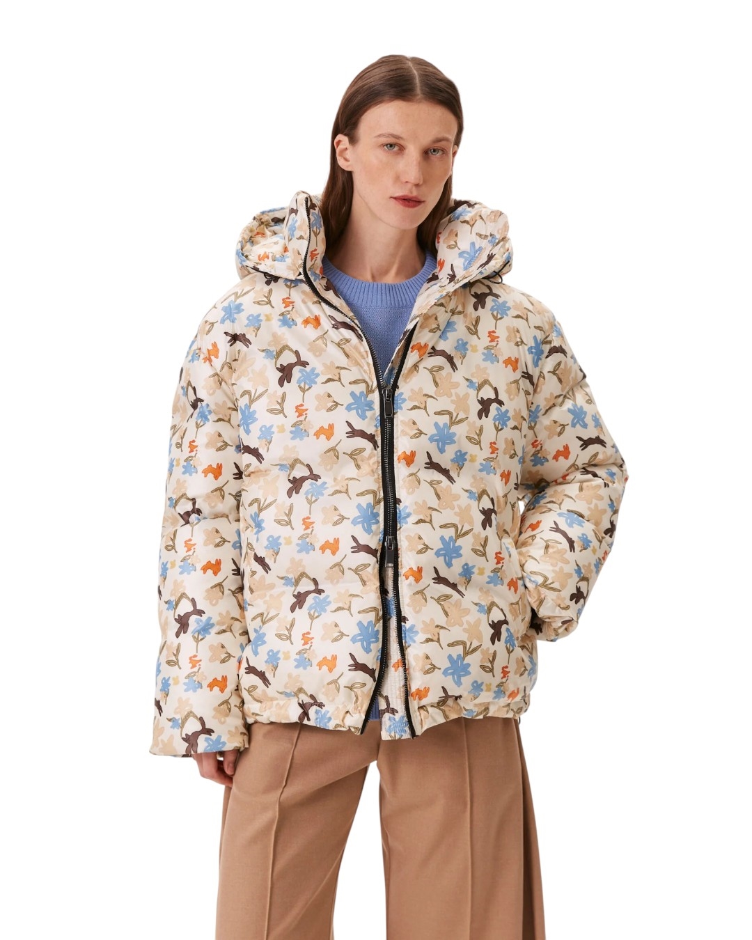 Пуховик прямого силуэта с авторским принтом MAGIC FLOWERS в молочном цвете. Модель со съемным капюшоном и прорезными карманами с потайными магнитами.