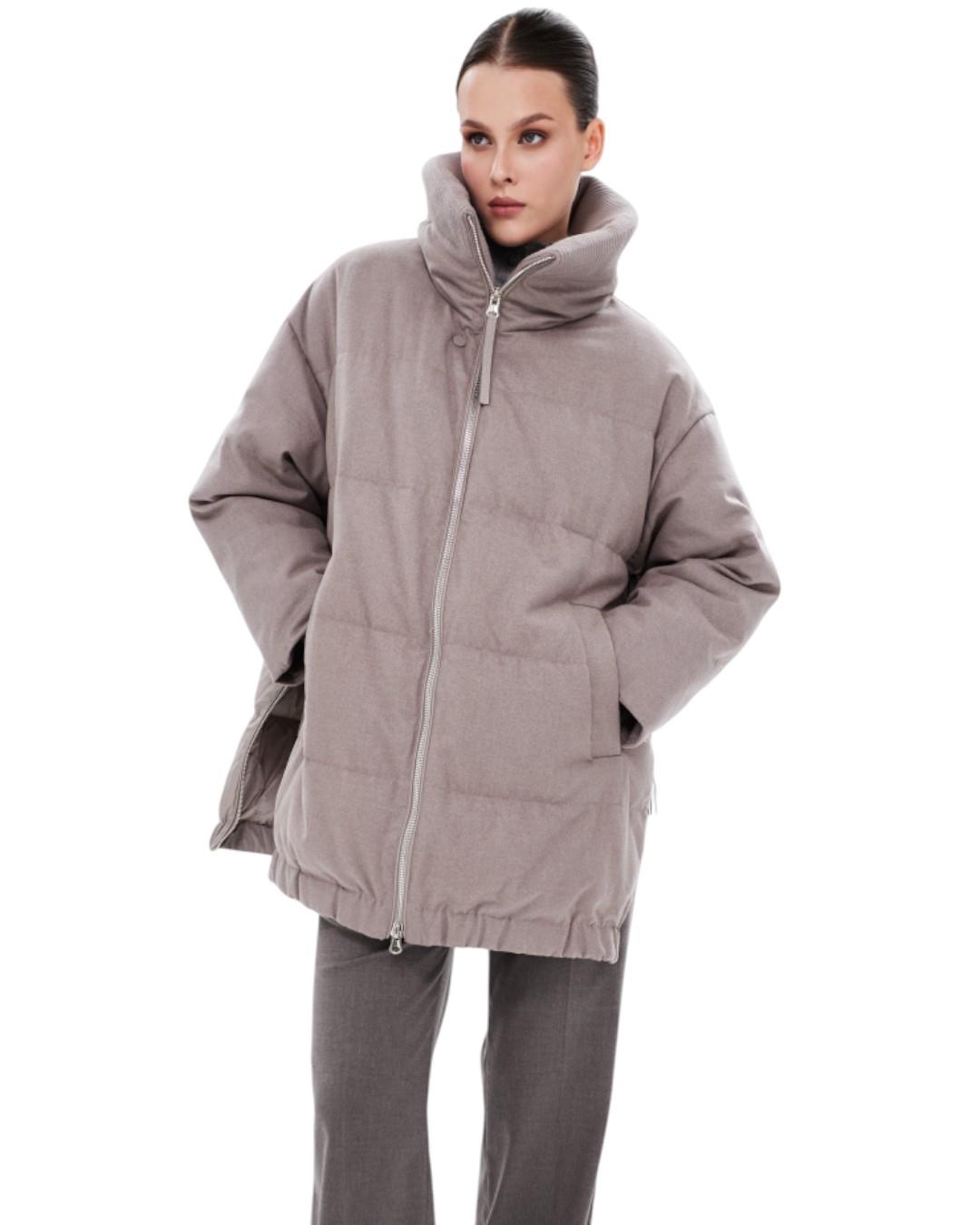 Пуховик с акцентом на детали. Воротник дополнен вставкой из вязаного материала, добавляя фактурности. Объём по низу изделия регулируется, позволяя адаптировать посадку под свой комфорт. Модель застёгивается на молнию — просто и функционально.