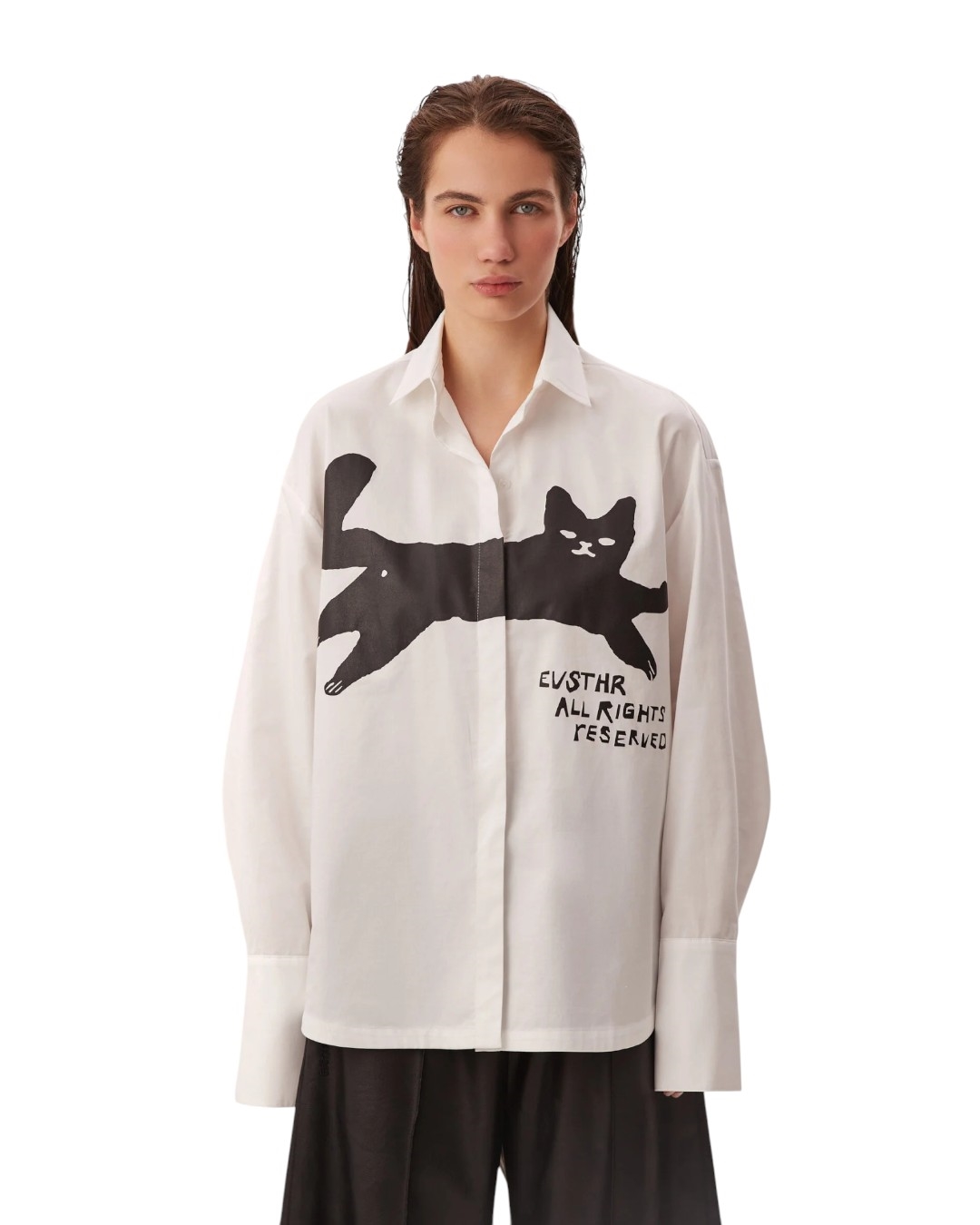 Рубашка свободного силуэта из натурального хлопка в черно-белом цвете с авторским принтом CAT SURF. Модель с чуть спущенной линией плеча и складкой на спинке.
