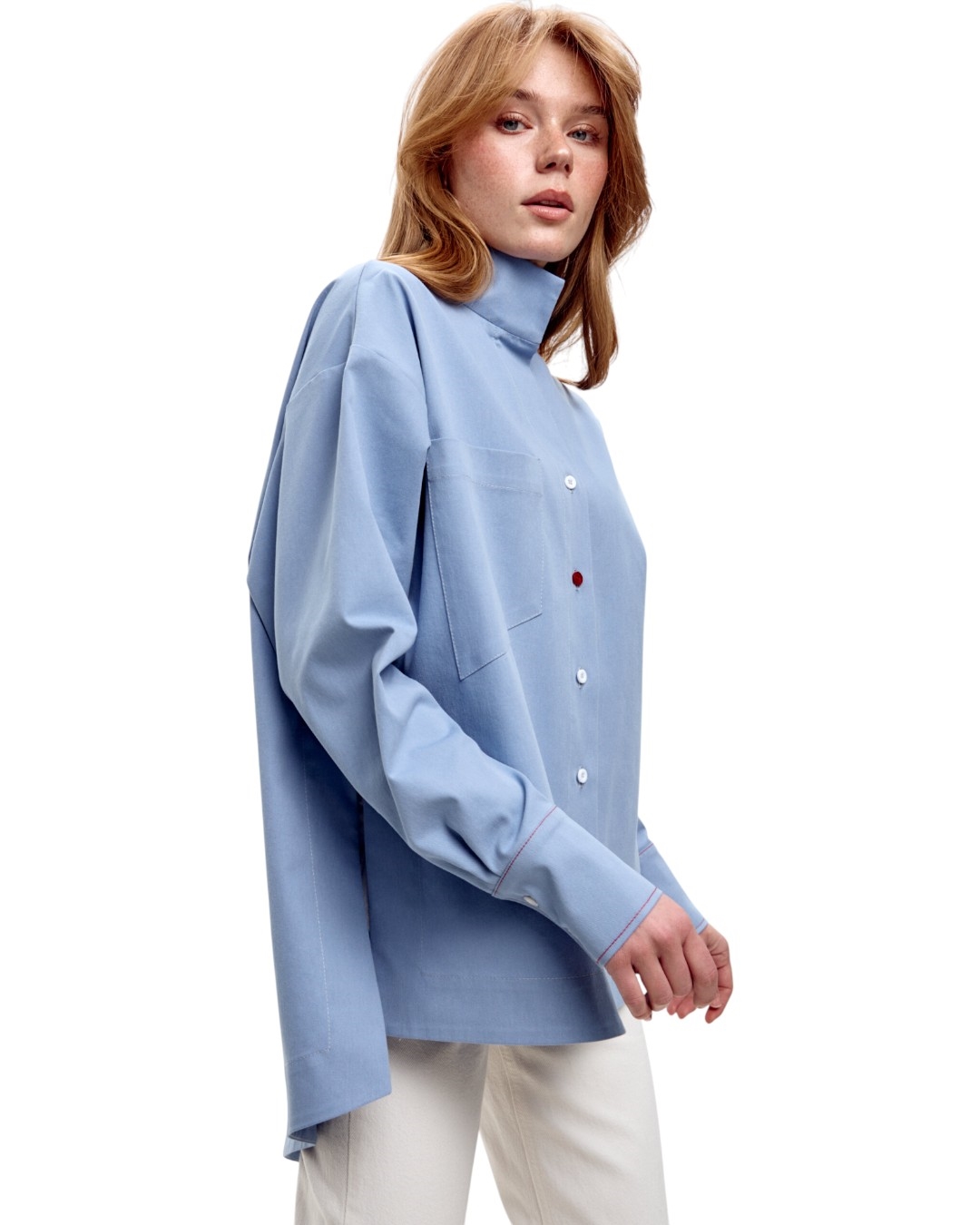 Базовая голубая рубашка свободного кроя с интересными яркими деталями из плотного хлопка. Красная строчка на манжетах, пара красных пуговиц и красная бейка внутри воротника-стойки добавляют изделию особенный шарм. V-образная удлиненная спинка красиво сочетается с асимметричным карманом