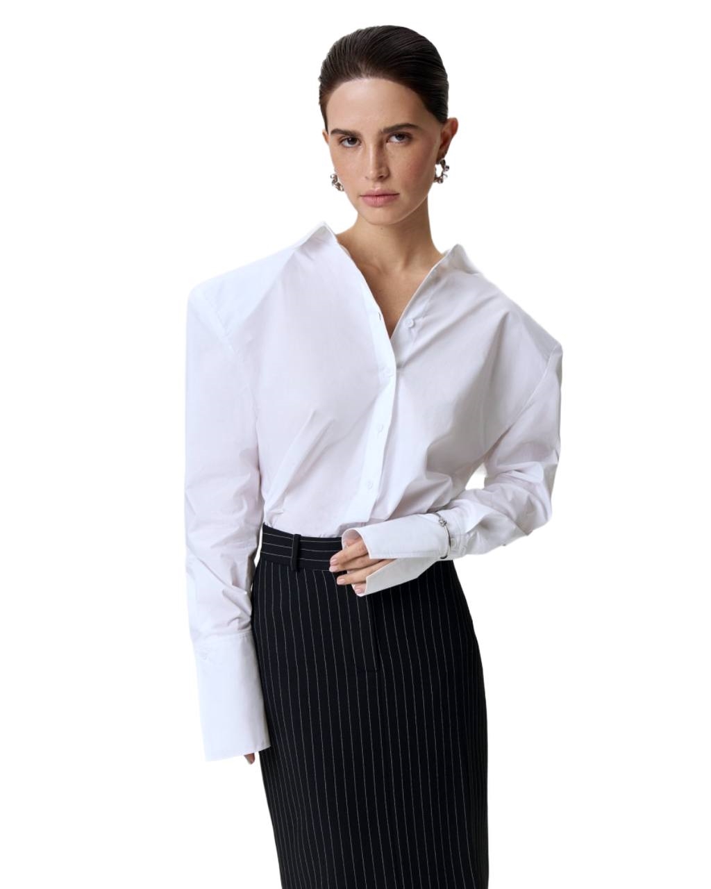 За счёт сложного фасона минималистичная рубашка выходит за рамки классического базового гардероба, при этом остаётся универсальной вещью, органично вписывающейся в разные образы. Модель с акцентными плечами и широкими отложными манжетами отлично сочетается со строгой деловой одеждой, а в паре с более расслабленными вещами, например, кожаной юбкой или шортами, создаёт броские образы для эффектного досуга. Рубашка выполнена из хлопка — натурального гипоаллергенного материала, благодаря которому кожа дышит.