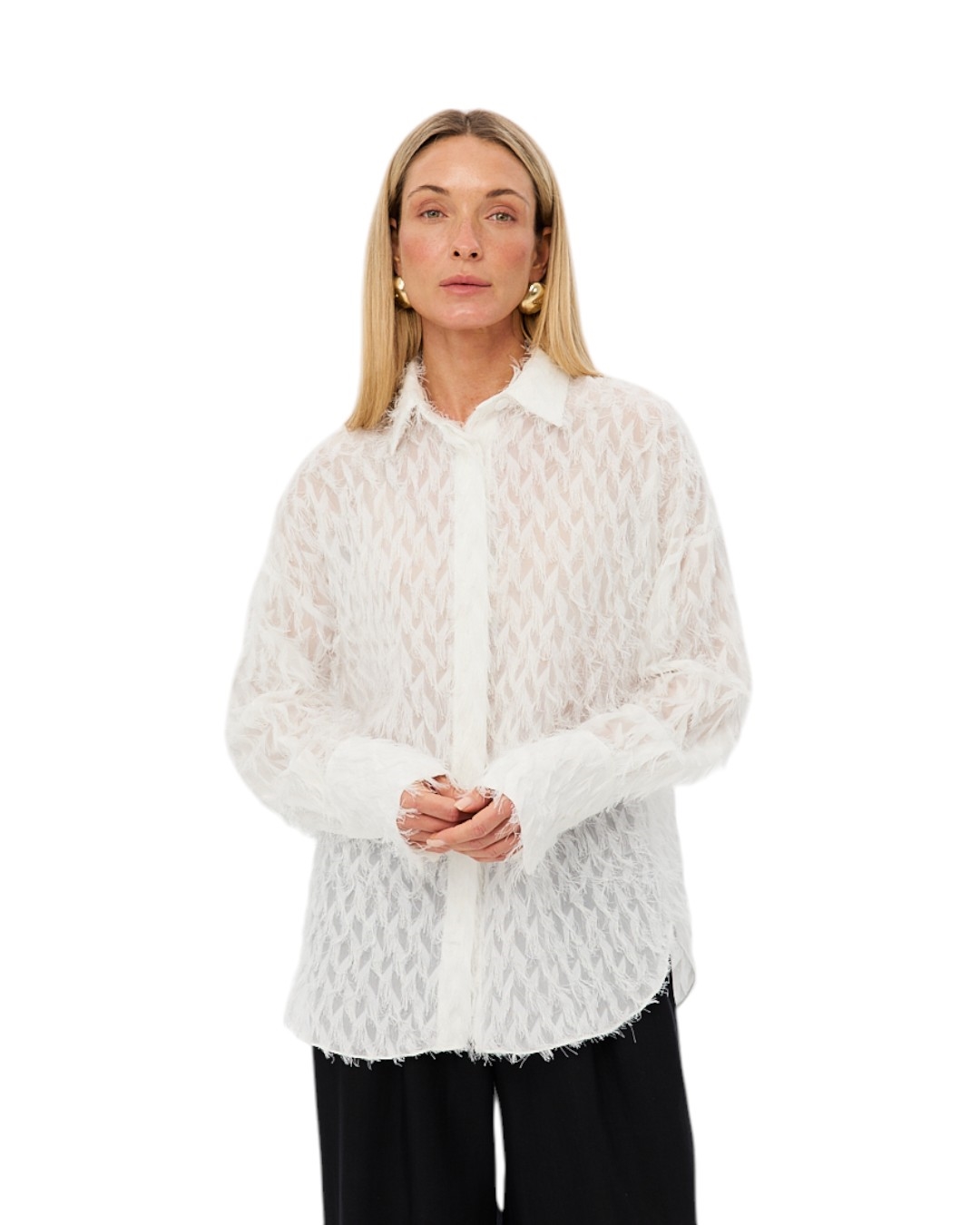 Изысканная рубашка свободного силуэта из фактурного материала классической цветовой гаммы: белая и черная. Отложной воротник, спущенная линия плеч, широкие манжеты и закругленный край по низу. Модель дополнена бахромой по всей длине, создает неповторимый образ, который идеально вписывается в актуальный стиль old money.