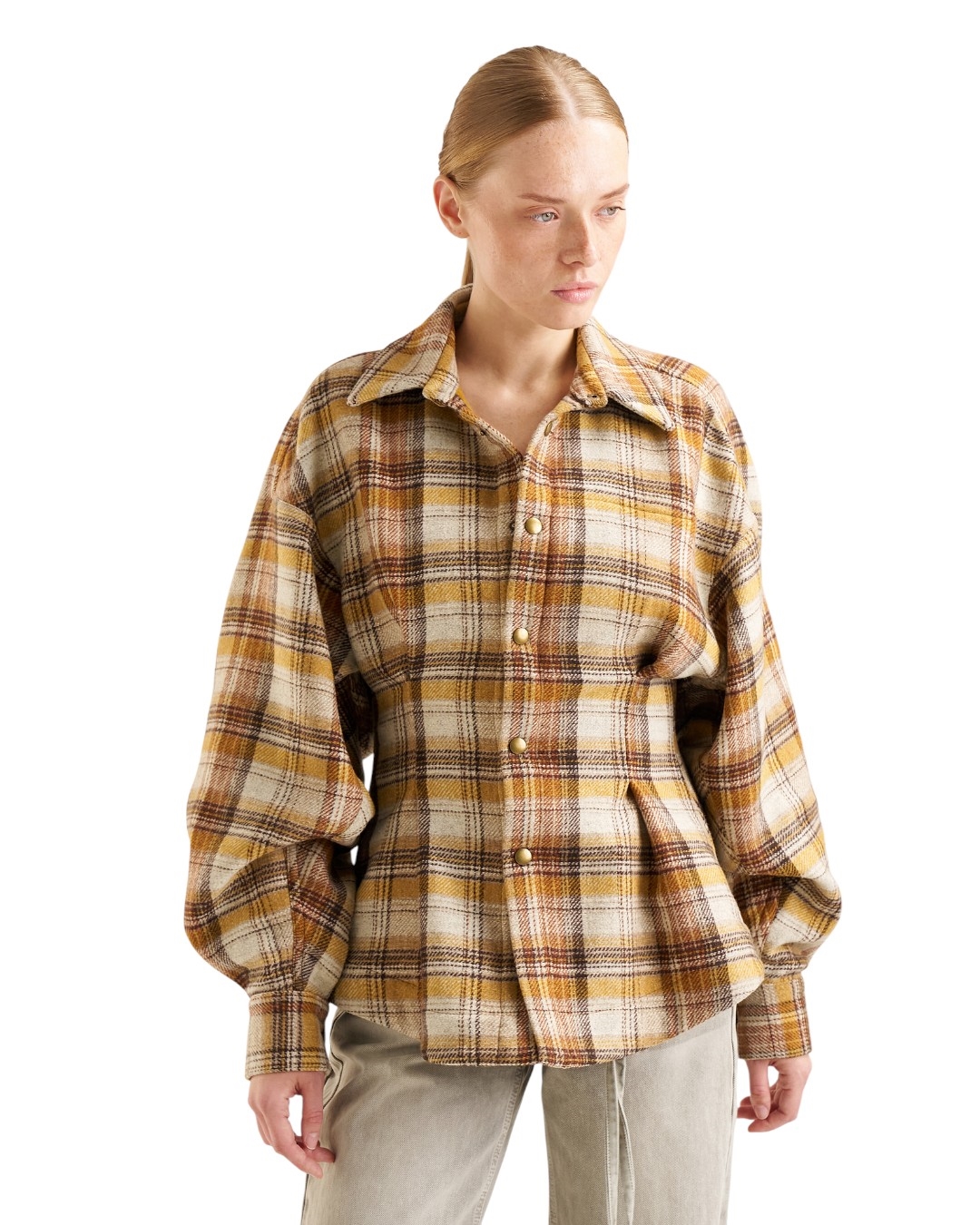 Приталенный крой, подчеркивающий талию — ключевая особенность этой модели. Рубашка не просто облегает фигуру, а создает изящный силуэт благодаря контрасту: объемная спина и пышные рукава визуально усиливают женственность линий, делая талию выразительной.
