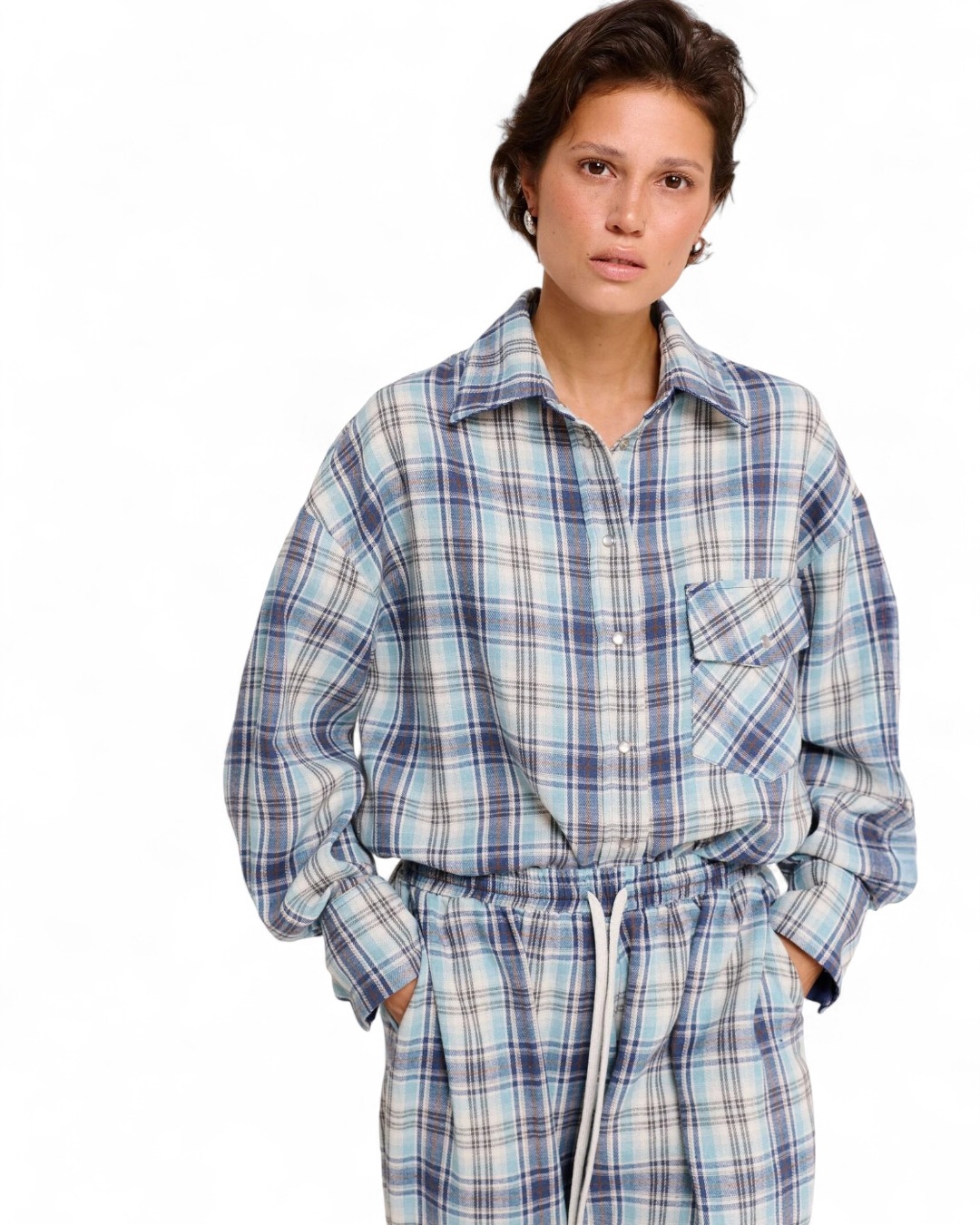 Свободная рубашка в клетку с маленькими секретами: под воротом и на манжетах скрыт винтажный деним – деталь, которую можно либо скрыть, либо эффектно показать.