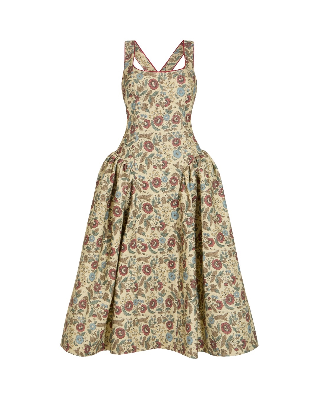 Сарафан с принтом "Ивановские ситцы" приталенного силуэта из фактурного хлопка на широких бретелях. Вырез карэ с контрастной отделкой терракотового цвета. Подрез на линии бедер создает архитектурный силуэт и подчеркивает изящность талии. Платье на подкладке, застежка молния по центру спинки.