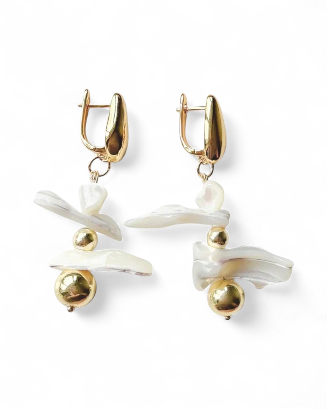 Серьги в золоте с подвеской из ломаного перламутра и вставками золотого гематита