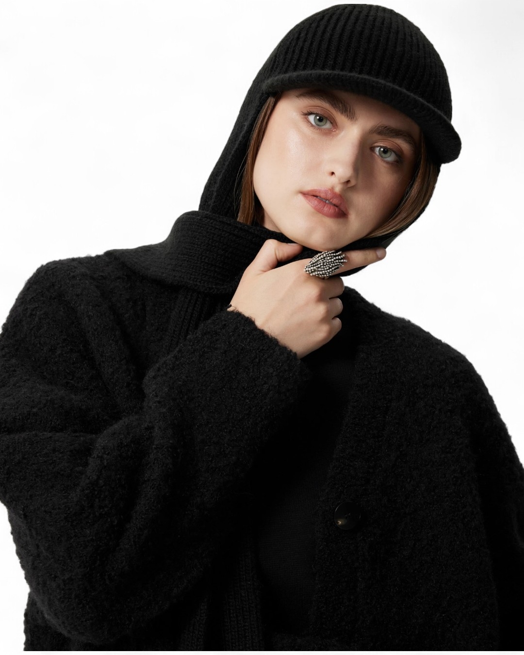 Вязаная шапка с жёстким козырьком и длинными "ушами" — интересный аксессуар, объединяющий мягкий уютный шарф и вязаную бейсболку. Она придаёт любому аутфиту динамику спортивного стиля и делает его элегантным и даже немного загадочным. Форма и длина ниспадающих элементов — "ушей" — позволяет завязывать их разными способами, а также перекидывать через плечо, создавая образ таинственной незнакомки. Шапка выполнена из пряжи с преобладанием акрила, что делает её очень мягкой, лёгкой, пластичной, обеспечивающей нежное прикосновение к коже.