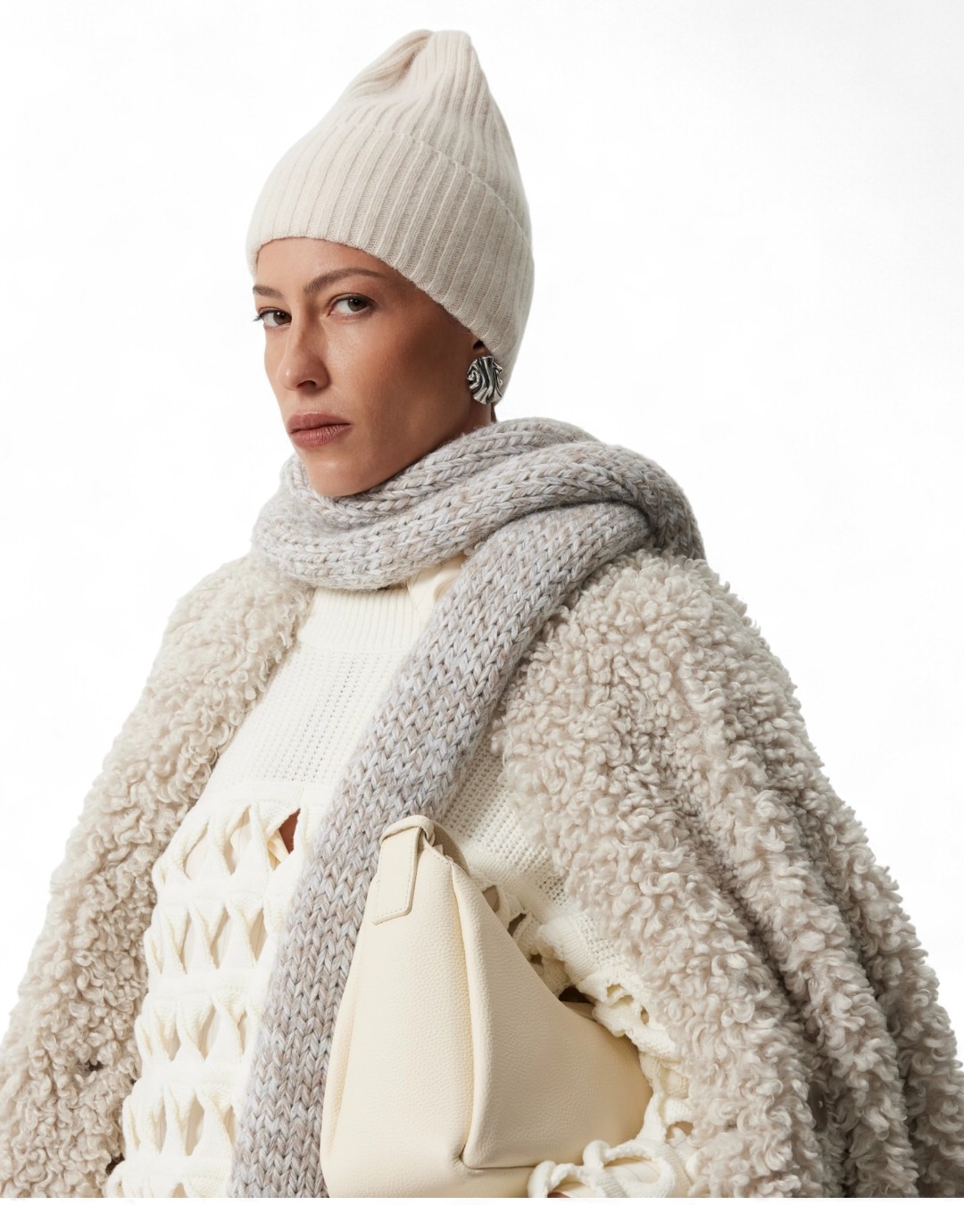 Тёплая шапка с широким отворотом проявит себя с лучшей стороны в холодное время года. Шапка связана рибом из смесовой пряжи с высоким содержанием шерсти, очень приятной при тактильном контакте. Благородный молочный цвет делает шапку универсальной, отлично вписывающейся и в монохромные комплекты, и в аутфиты, построенные на контрасте.