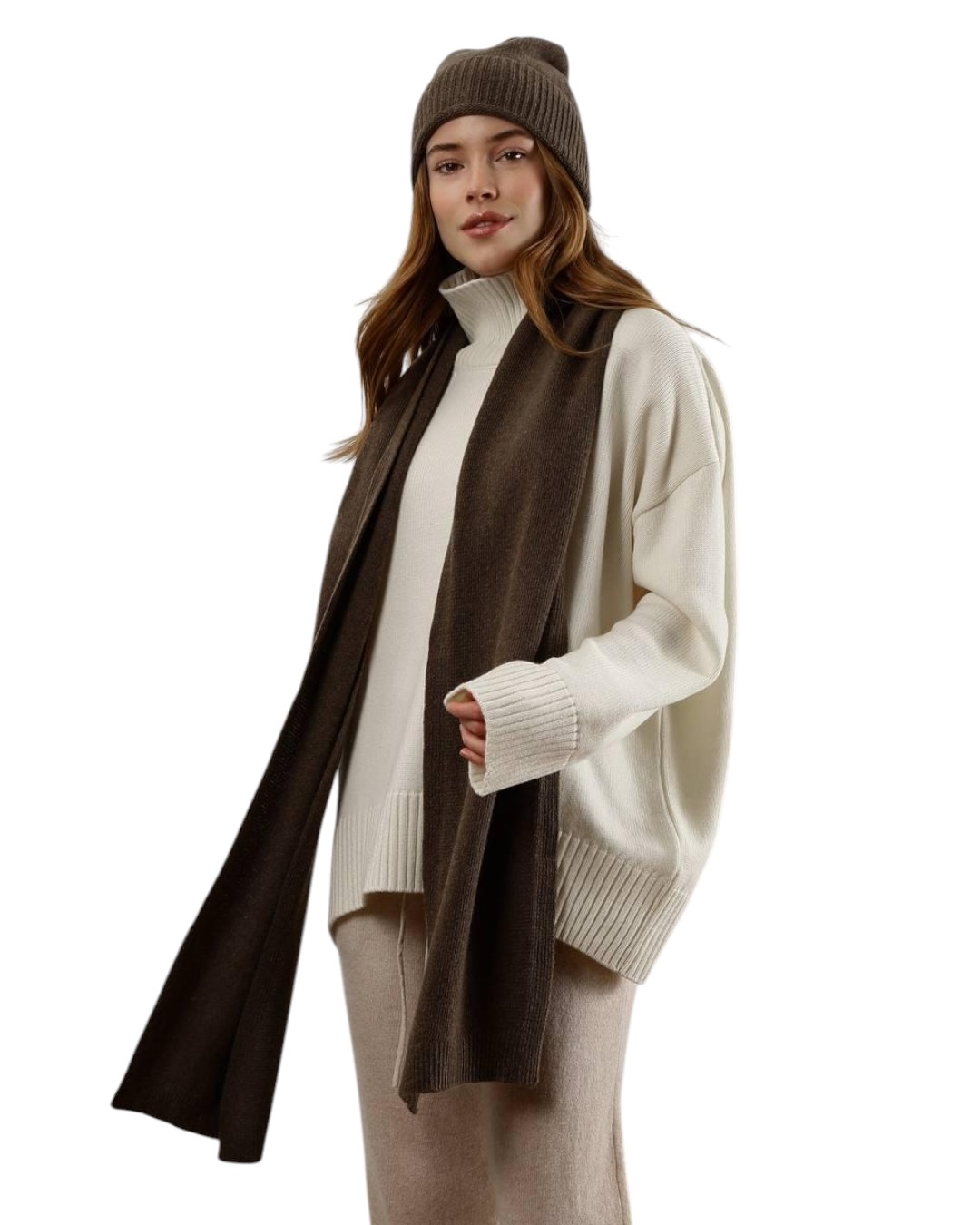 Стильный комплект из итальянской шерсти мериноса и нежного кашемира в оттенке шоколад. Универсальные оттенки легко сочетать в образе с верхней одеждой.