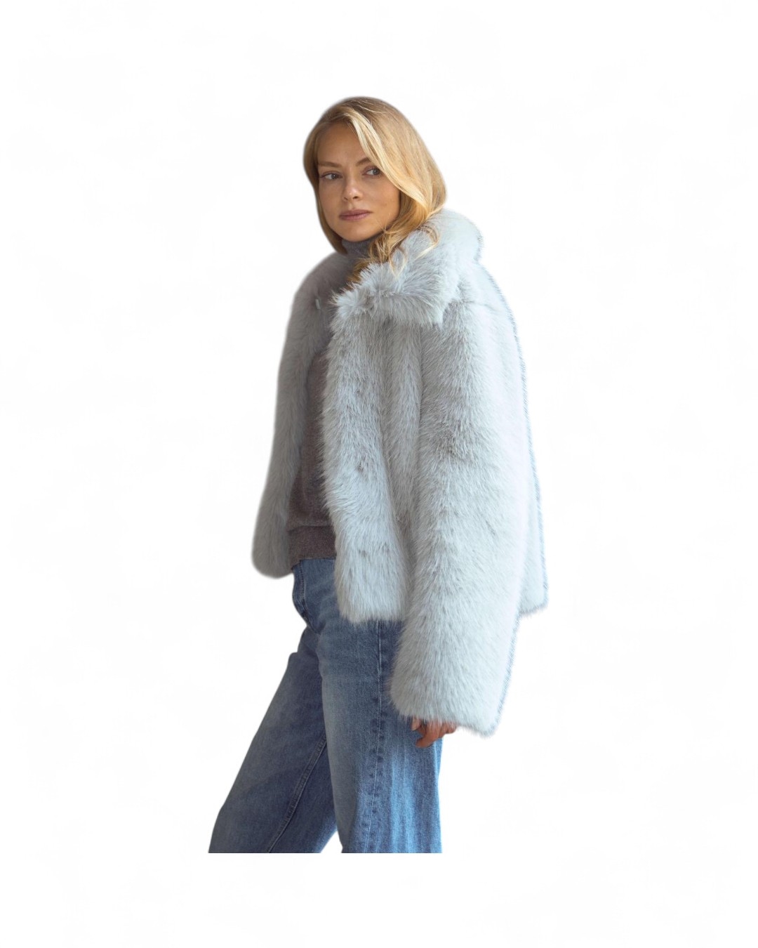 Шуба из искусственного меха премиального качества в благородном светло-сером оттенке с лёгким серебристым переливом.