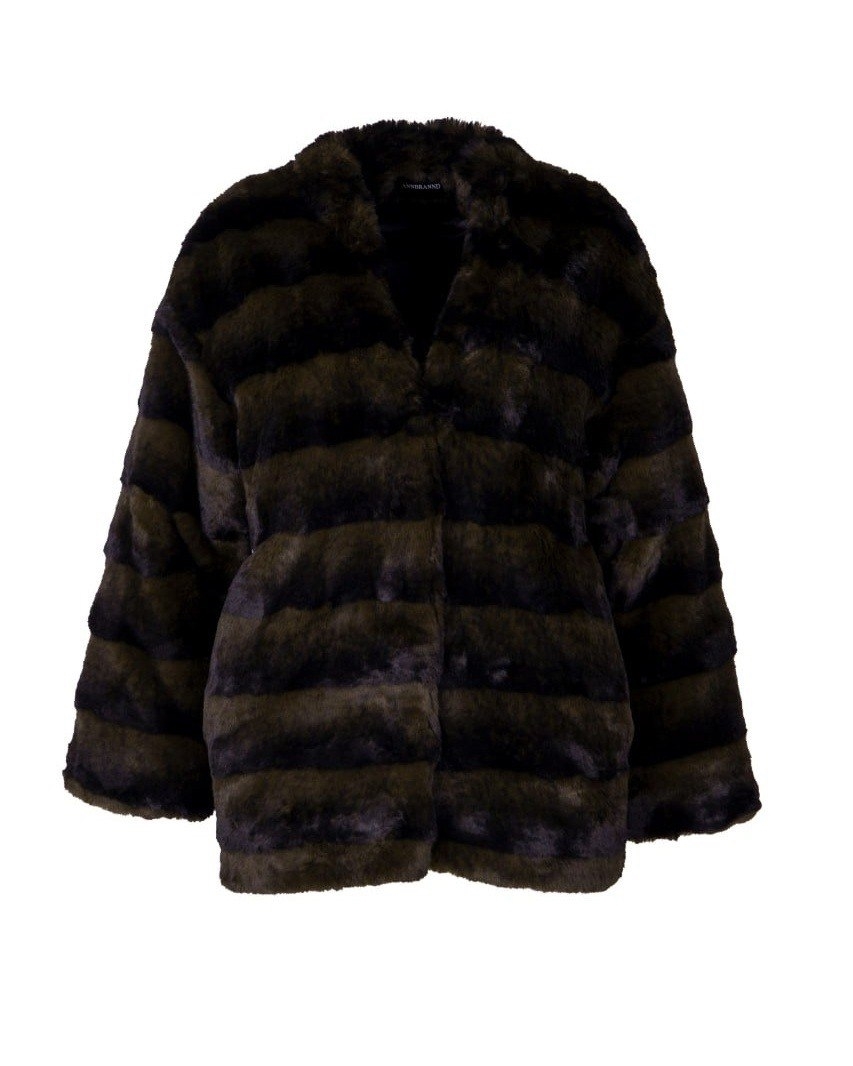 Шуба из трендового материала – итальянского экомеха. Благодаря свободному крою шуба отлично сидит как на размере XS, так и на L размере..Минималистичный дизайн дополняют V-образный вырез, карманы и полосатый патерн слегка зеленоватого цвета.