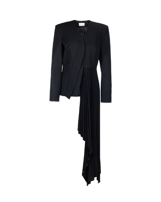 Жакет асимметричного кроя с акцентной плиссированной деталью. На подкладке, полуприлегающий силуэт.