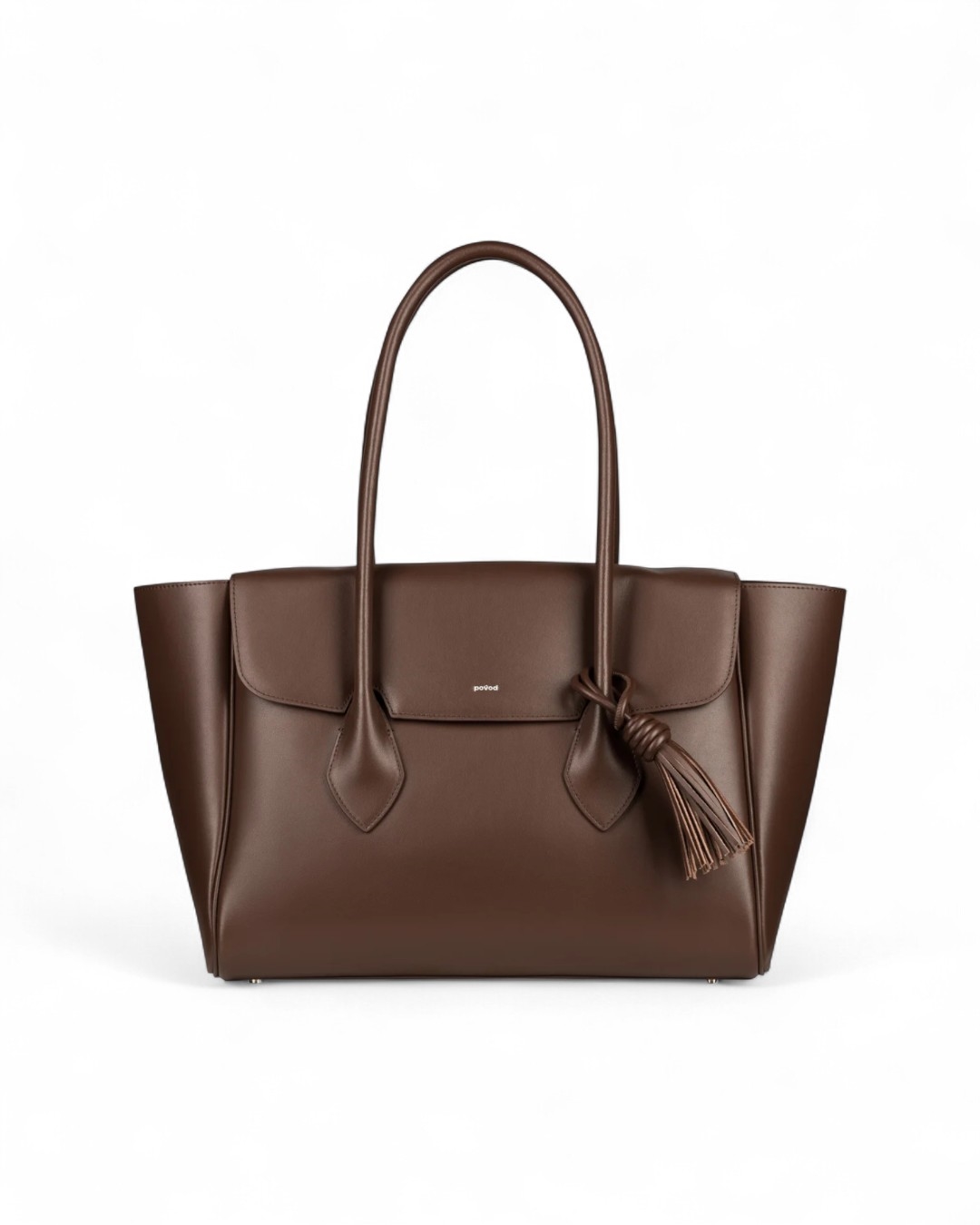 Сумка выполнена из прочной гладкой матовой кожи, плоское дно обеспечивает устойчивость, а просторное основное отделение вмещает всё необходимое — от документов до сменной одежды.