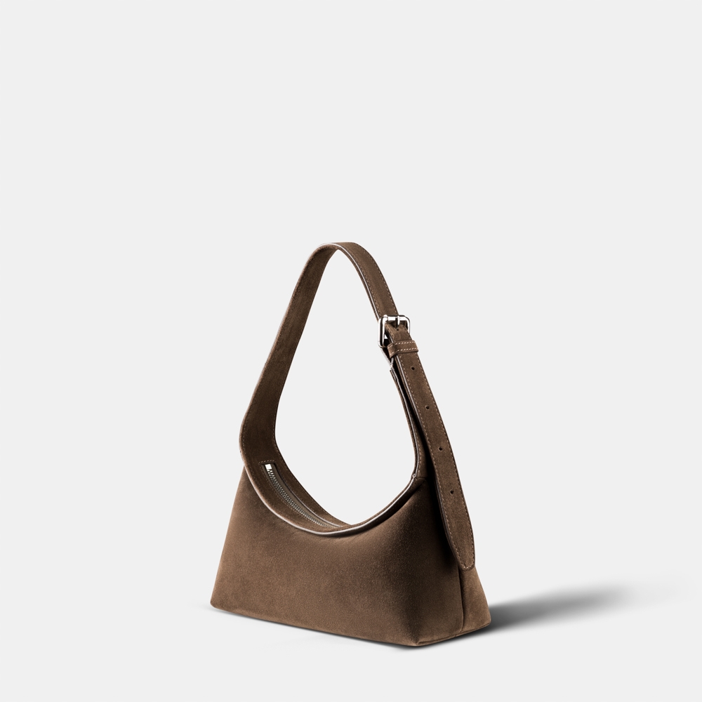 Эта миниатюрная хобо выполнена из итальянской замши премиального качества, что придает ей особый лоск. Регулируемый плечевой ремень позволяет подобрать оптимальную длину для комфортного ношения сумки. Модель дополнена одним отделением на молнии, в которое вмещается все необходимое.