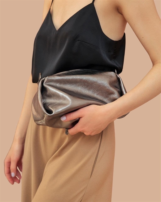 Маленькая сумка из мягкой кожи, на молнии, внутренний карман и съемные кольца-карабины. В комплекте цепочка длиной 120 см.