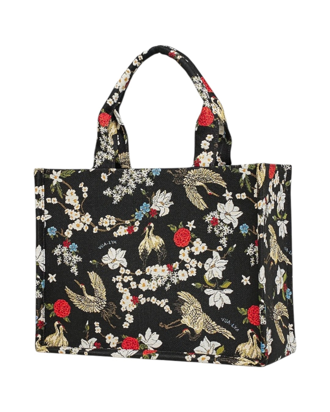 Тоут в расцветке «Сакура» - это эффектные журавли, бутоны цветущей японской вишни и магнолии, ветки деревьев, сложенные в изящный узор. Восточные мотивы принта, перенесенные на сумки, аксессуары и кимоно - вне времени.