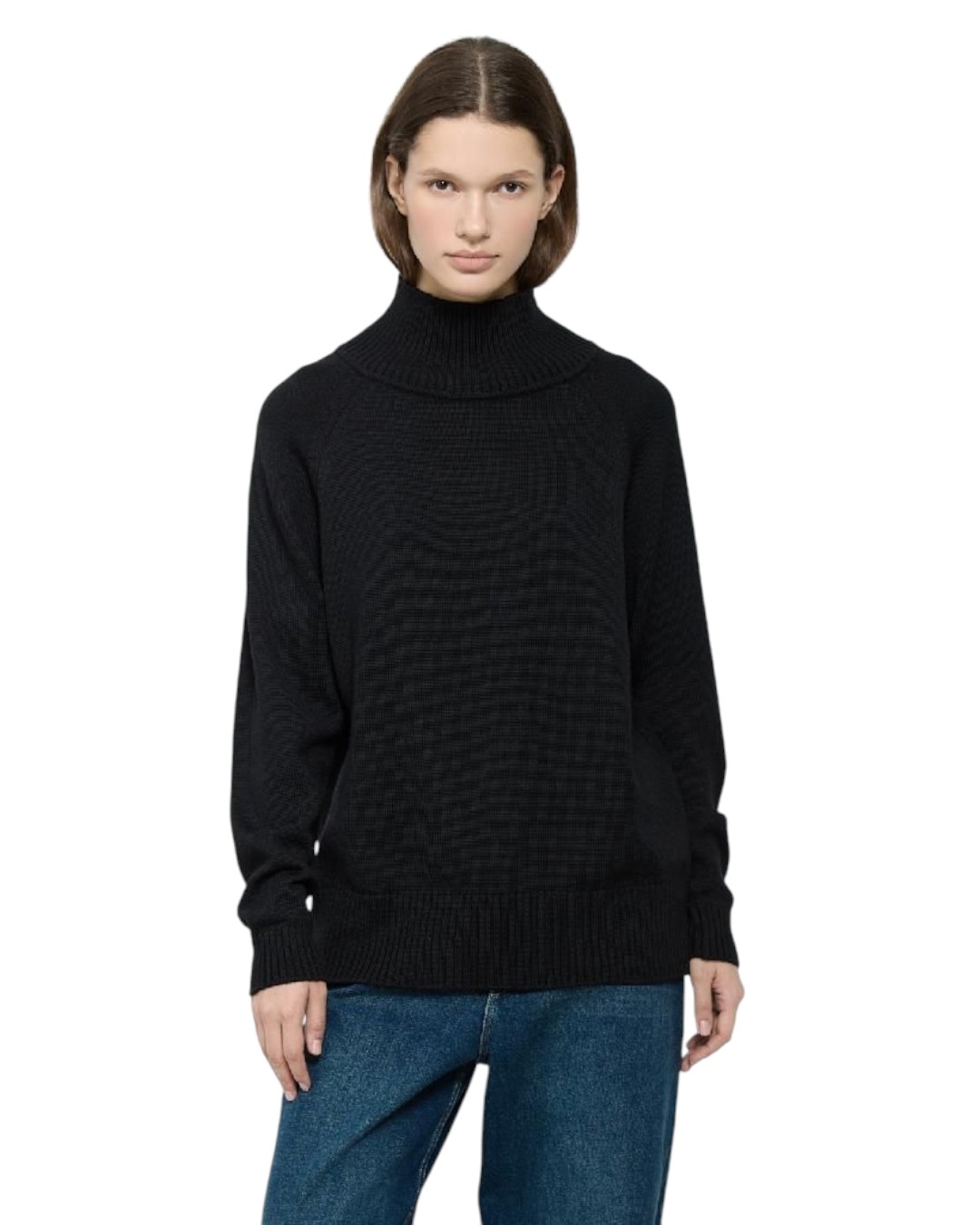 Базовый свитер прямого кроя, выполнен из 100% мериносовой шерсти. Высокий воротник-стойка, вывязанный в резинку, длинный рукав реглан с манжетой в резинку по низу. По низу изделия вывязана широкая резинка, чуть стягивает и делает силуэт слегка о-образным. Средней плотности, очень теплый.