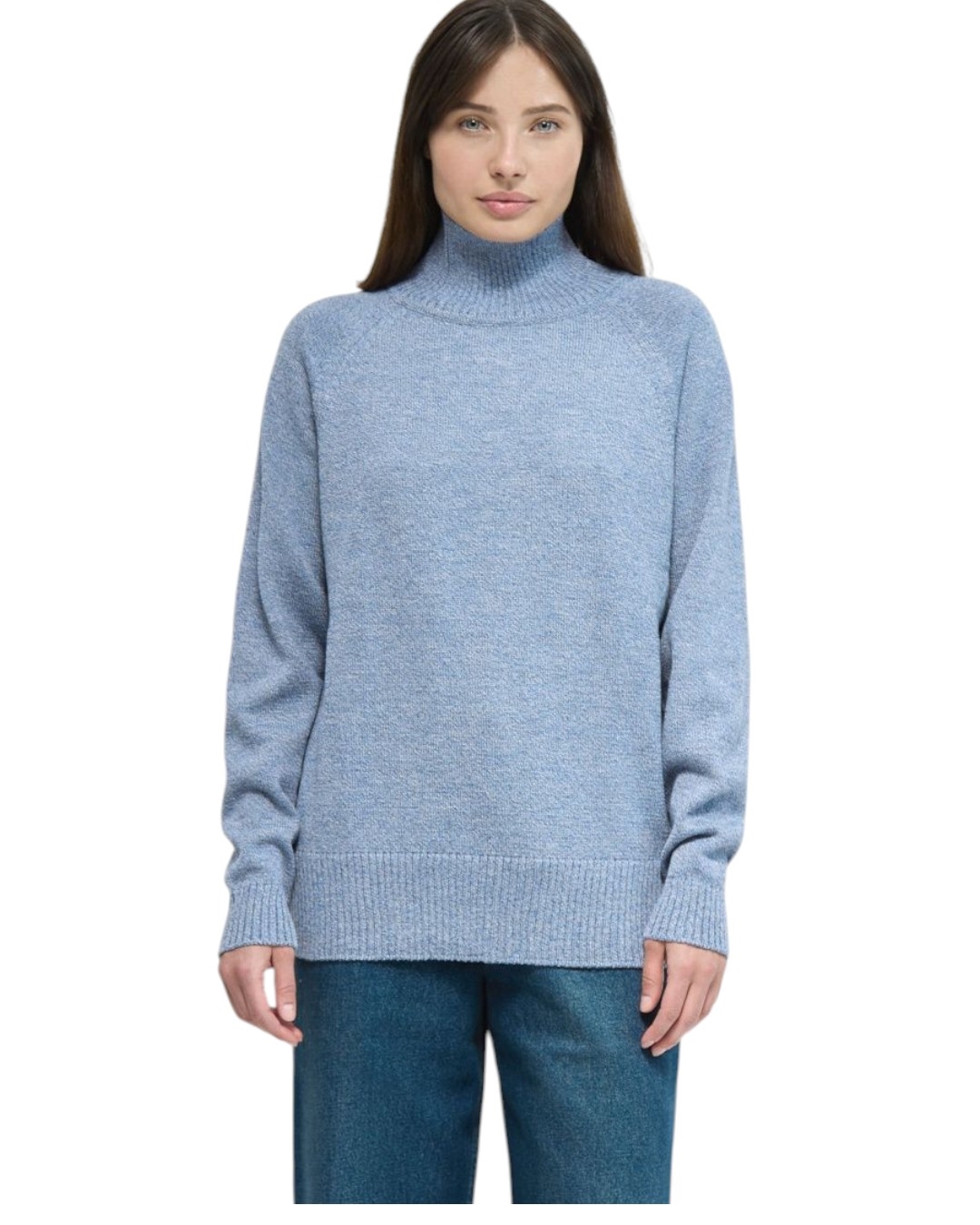 Базовый свитер прямого кроя, выполнен из 100% мериносовой шерсти. Высокий воротник-стойка, вывязанный в резинку, длинный рукав реглан с манжетой в резинку по низу. По низу изделия вывязана широкая резинка, чуть стягивает и делает силуэт слегка о-образным. Средней плотности, очень теплый.