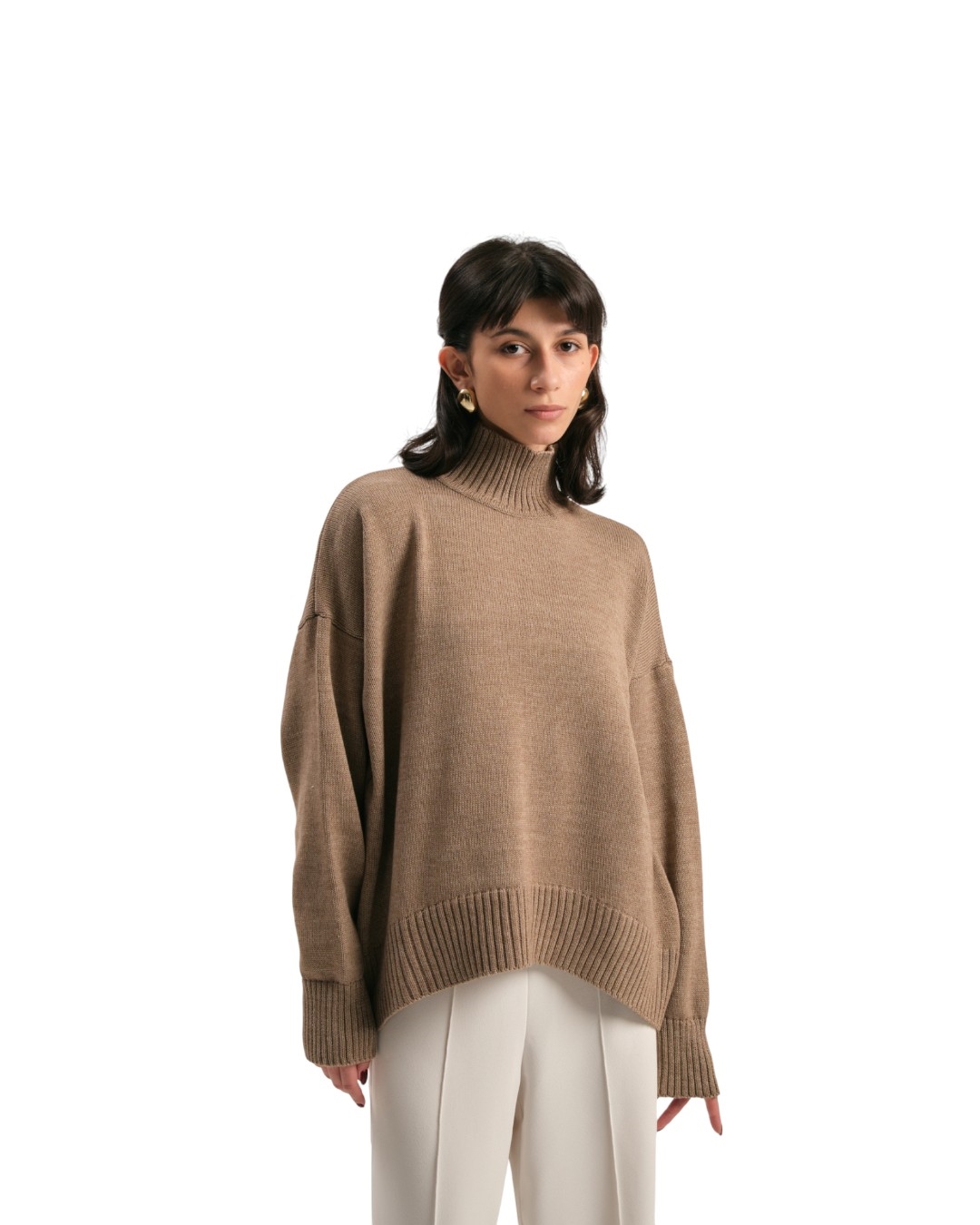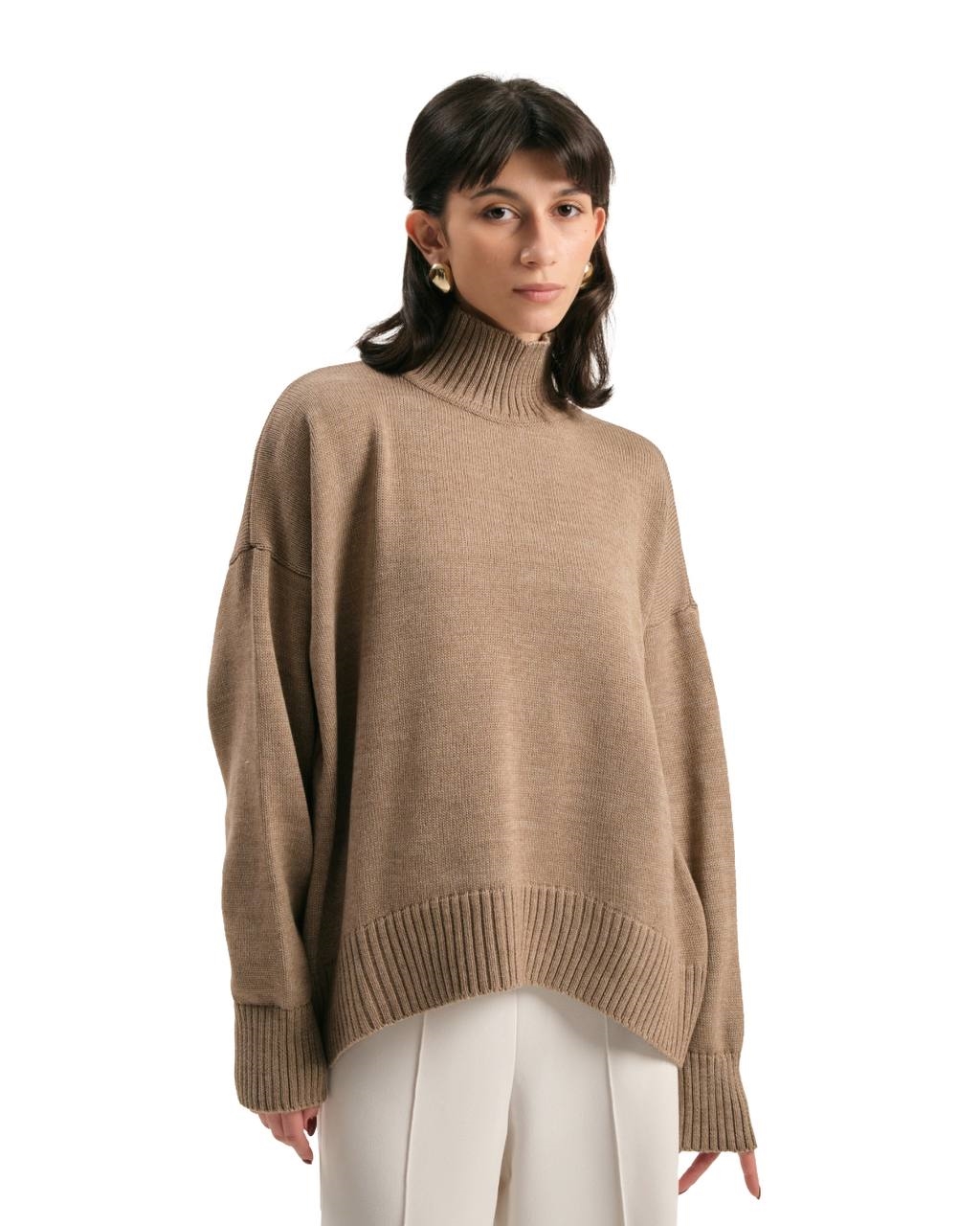 Cвитер с воротником стойкой, слегка удлиненной спинкой и аркой спереди.