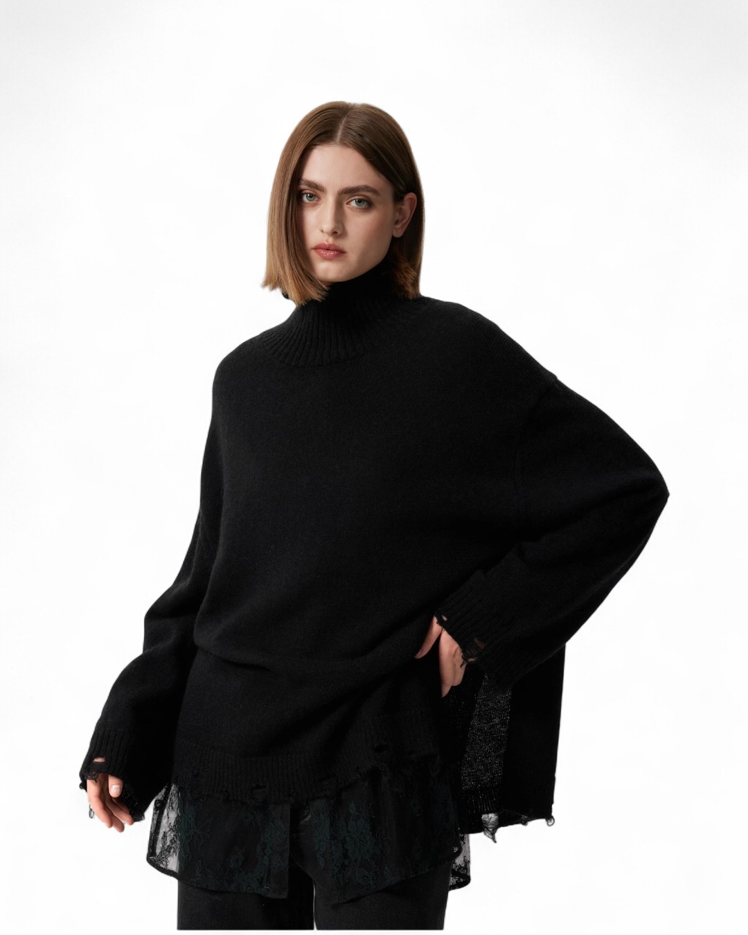 Черный свитер силуэта оверсайз - яркий интересный элемент образа. Дизайн модели вдохновлен стилем гранж с характерными для него выразительными чертами. Спуски петель, повреждения вязаной поверхности, дестрой эффект по нижнему краю, горловине и рукавам - визуальные приметы вещи, бывшей в эксплуатации, подчеркивают смелый креативный имидж женщины, далекой от стереотипов. Свитер выполнен из смесовой пряжи с высоким содержанием шерсти мериноса и мохера. Мохер придает свитеру модную ворсовую структуру, делает его прекрасной составляющей образов для отдыха на природе, прогулке по городу и даже работы в офисе, приветствующем проявление индивидуальности. Свитер имеет высокие разрезы в боковых швах.