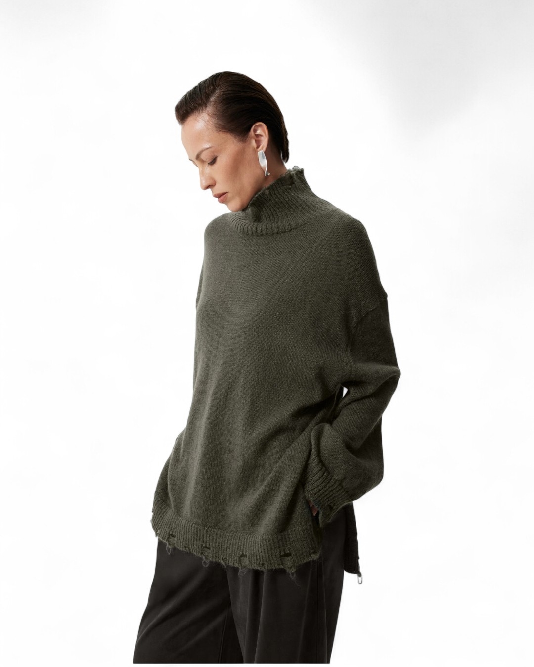 Оливковый свитер силуэта оверсайз — яркий интересный элемент образа. Дизайн модели вдохновлен стилем гранж с характерными для него выразительными чертами. Спуски петель, повреждения вязаной поверхности, дестрой эффект по нижнему краю, горловине и рукавам — визуальные приметы вещи, бывшей в эксплуатации, подчёркивают смелый креативный имидж женщины, далёкой от стереотипов. Свитер выполнен из смесовой пряжи с высоким содержанием шерсти мериноса и мохера, придающего ему ворсовую структуру. Он прекрасно впишется в непринуждённые образы для отдыха на природе, прогулке по городу, а также работы в офисе, приветствующем проявление индивидуальности. Свитер имеет высокие разрезы в боковых швах.