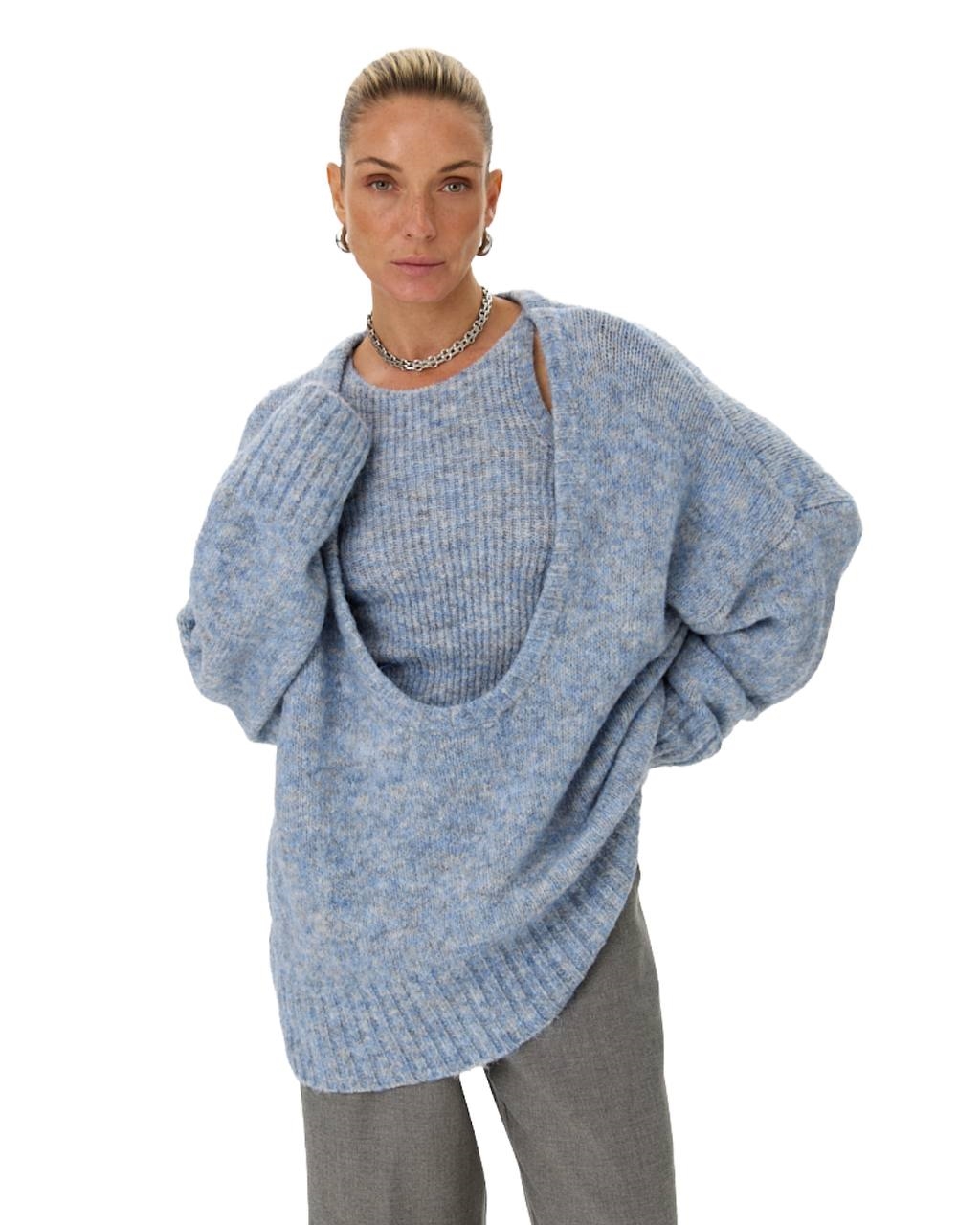 Сложно представить гардероб без теплого и уютного свитера, способного согреть в непогоду. Шерстяной свитер силуэта oversize нежного серого оттенка станет самой универсальной вещью в базе. Главным преимуществом данной модели является мягкая текстура, приятная к телу и оригинальная горловина. Глубокий вырез привлекает внимание к топу на тонких бретелях, который идет в комплекте.