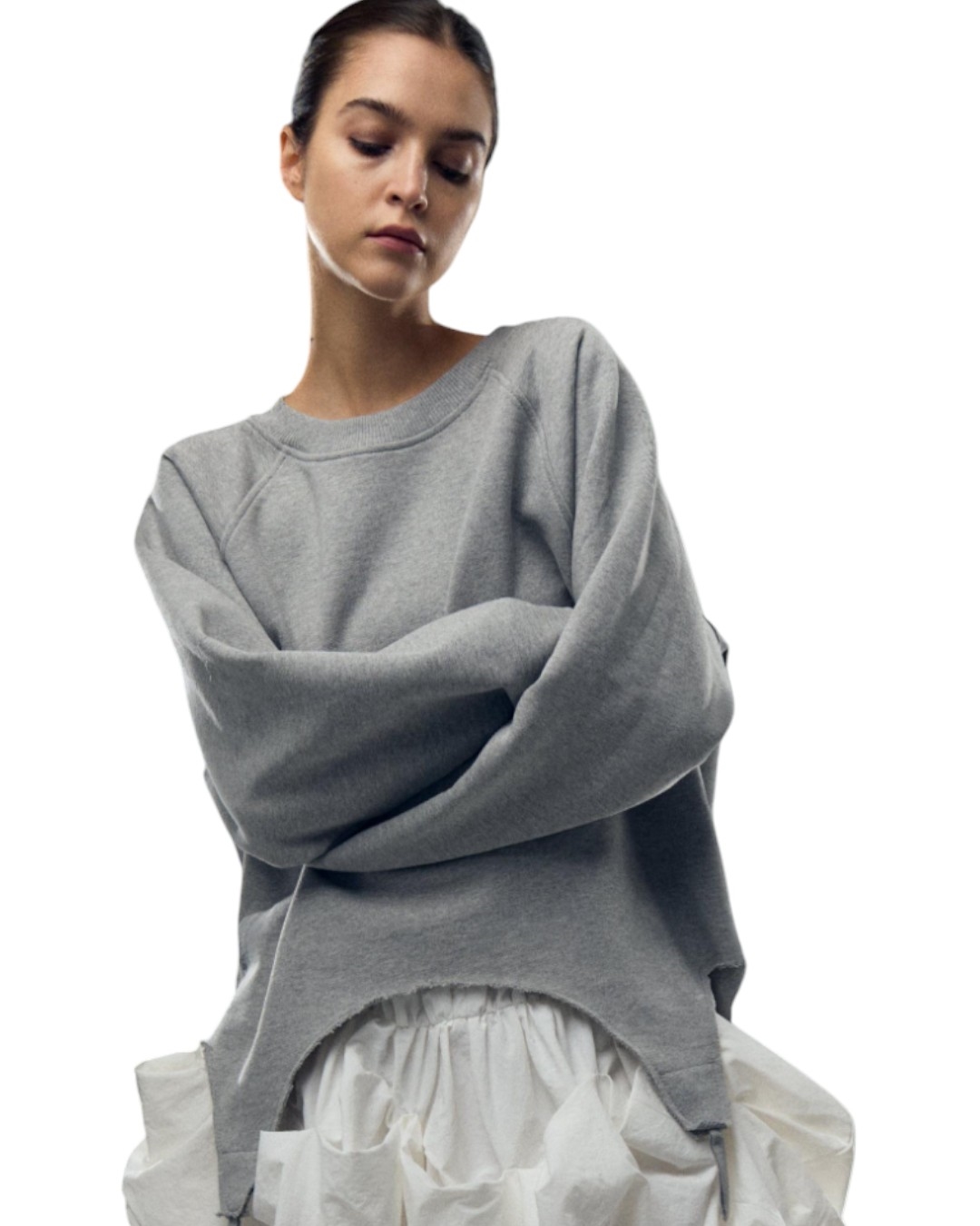 Серый свитшот с фигурным краем и вышивкой крестом на груди — гармоничное сочетание современного кроя и утончённых деталей. Фигурный низ придаёт образу динамику и стиль, а аккуратная вышивка крестом делает вещь уникальной и изысканной. Идеален для создания выразительного повседневного или кэжуал-лука.